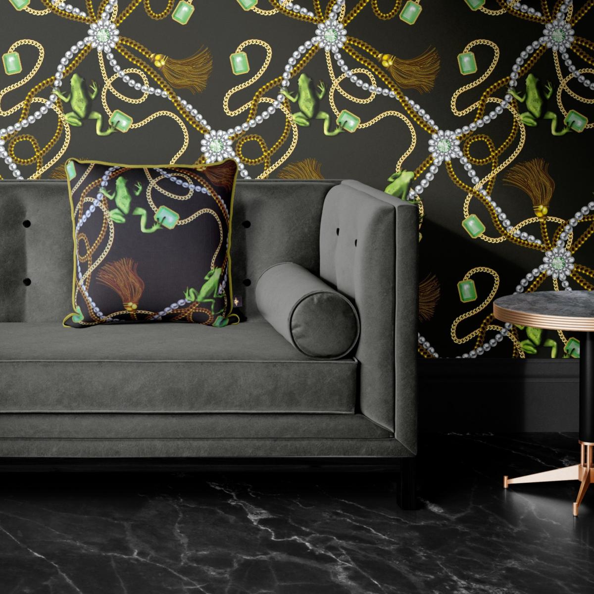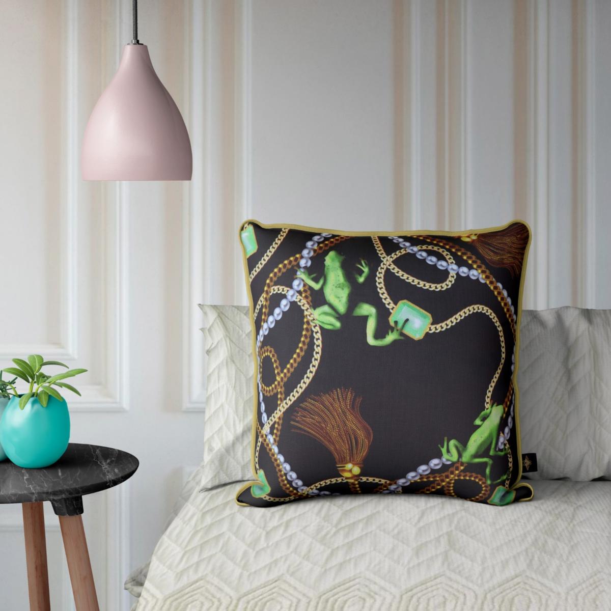 Inspired by the stories, emotions and feelings that can be imbued into precious objects, Tiana fuses the fantasy of fairytales with the opulence of fine jewellery. Sweeping tangles of chains and pearls protected by poisonous frogs create a bold nostalgic luxurious design. Our luxurious and shimmering velvet cushions are all hand cut, sewn and finished in the UK, featuring our dazzling pattern on both sides and accentuated with golden velvet piping cord detail. Each cushion is completed with a hidden zipper and golden scarab label. Size: 50cm x 50cm Outer: 100% Poly Velvet Filling: Soft Duck Feather