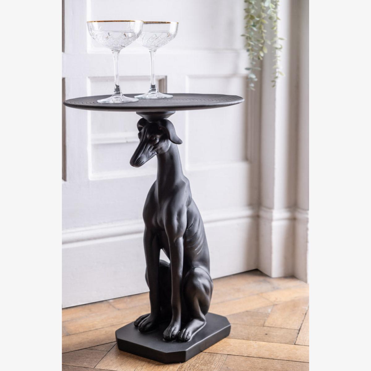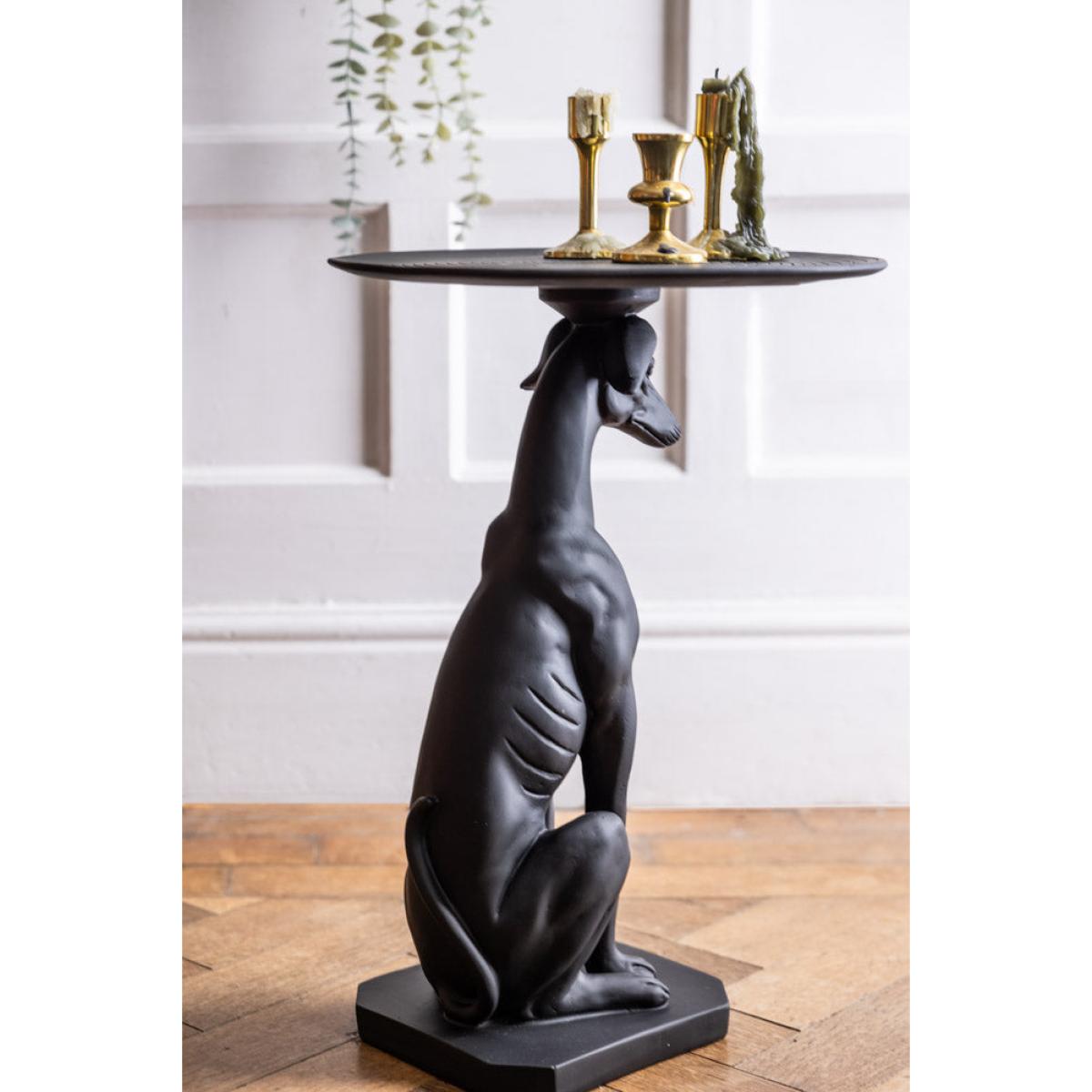 If there’s one thing RSG does well, it’s quirk. And it doesn’t get much quirkier than this side table, which comes in the shape of a greyhound (yes, you read that right) and makes the most fabulously eclectic addition to any living room. We love the sleekness of this handsome fella, who just happens to be balancing a tabletop on his head, making him useful as well as beautiful. The attention to detail on this piece is noteworthy, with facial features, tail and paws all sympathetically rendered to create a striking resemblance to the real thing! The matt black finish means this works with any colour scheme, too, and it’s guaranteed to create a talking point amongst friends and family. The dog’s slim frame makes this ideal for smaller spaces – slide in next to your favourite sofa or chair and you have a super-handy table that doesn’t take up too much space but is still able to hold a coffee cup (or glass of wine) and plate of nibbles easily. A unique statement piece that you’ll love forever – once seen, never forgotten! - Black Greyhound Dog Side Table - Material: Resin- Measures: H53cm x W37cm x D37cm