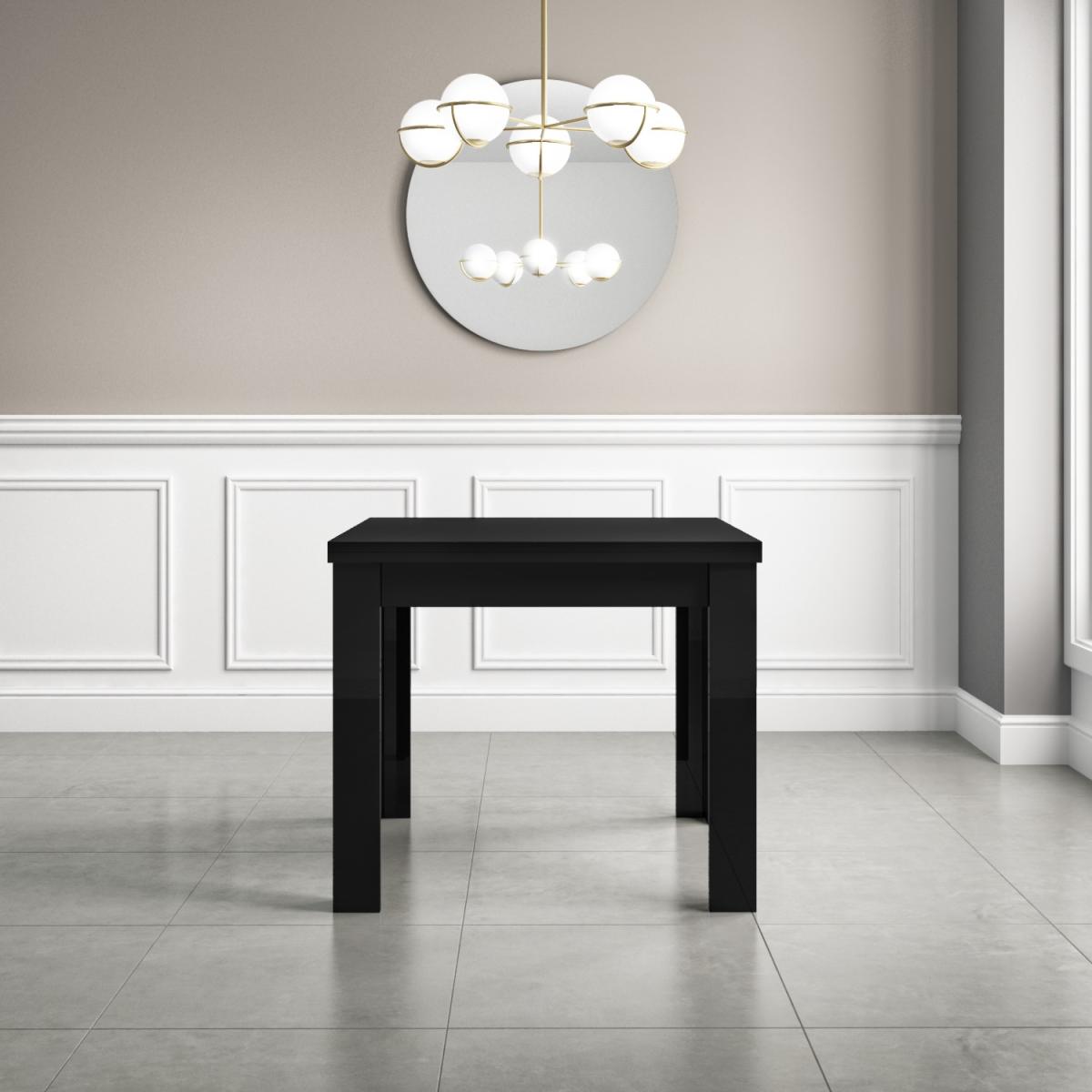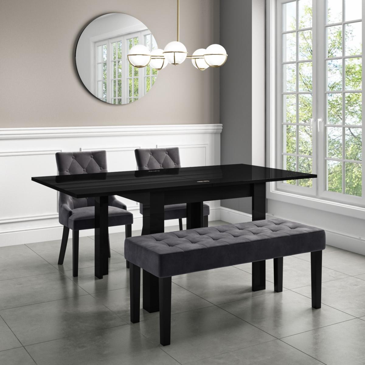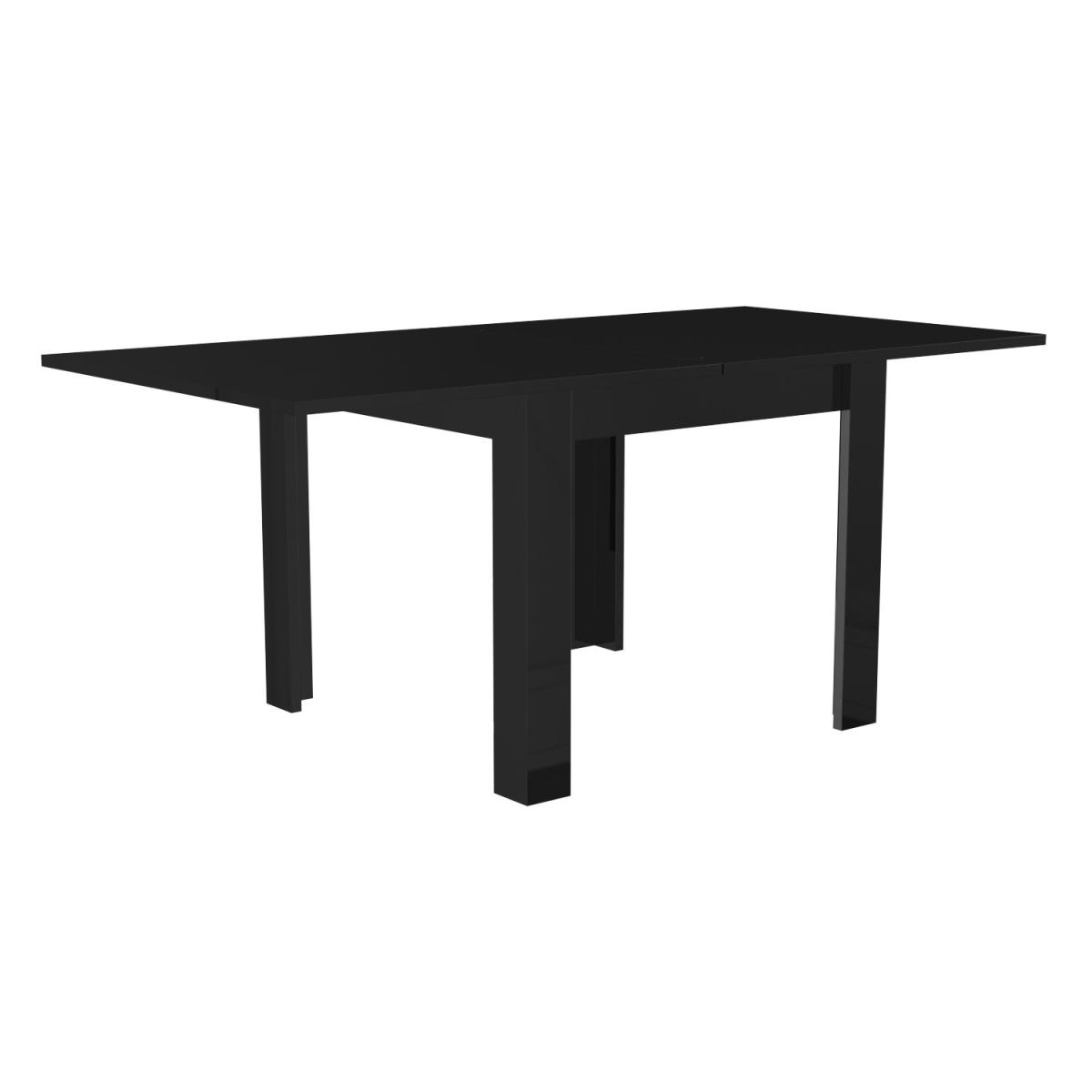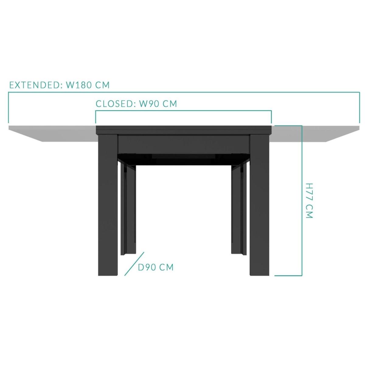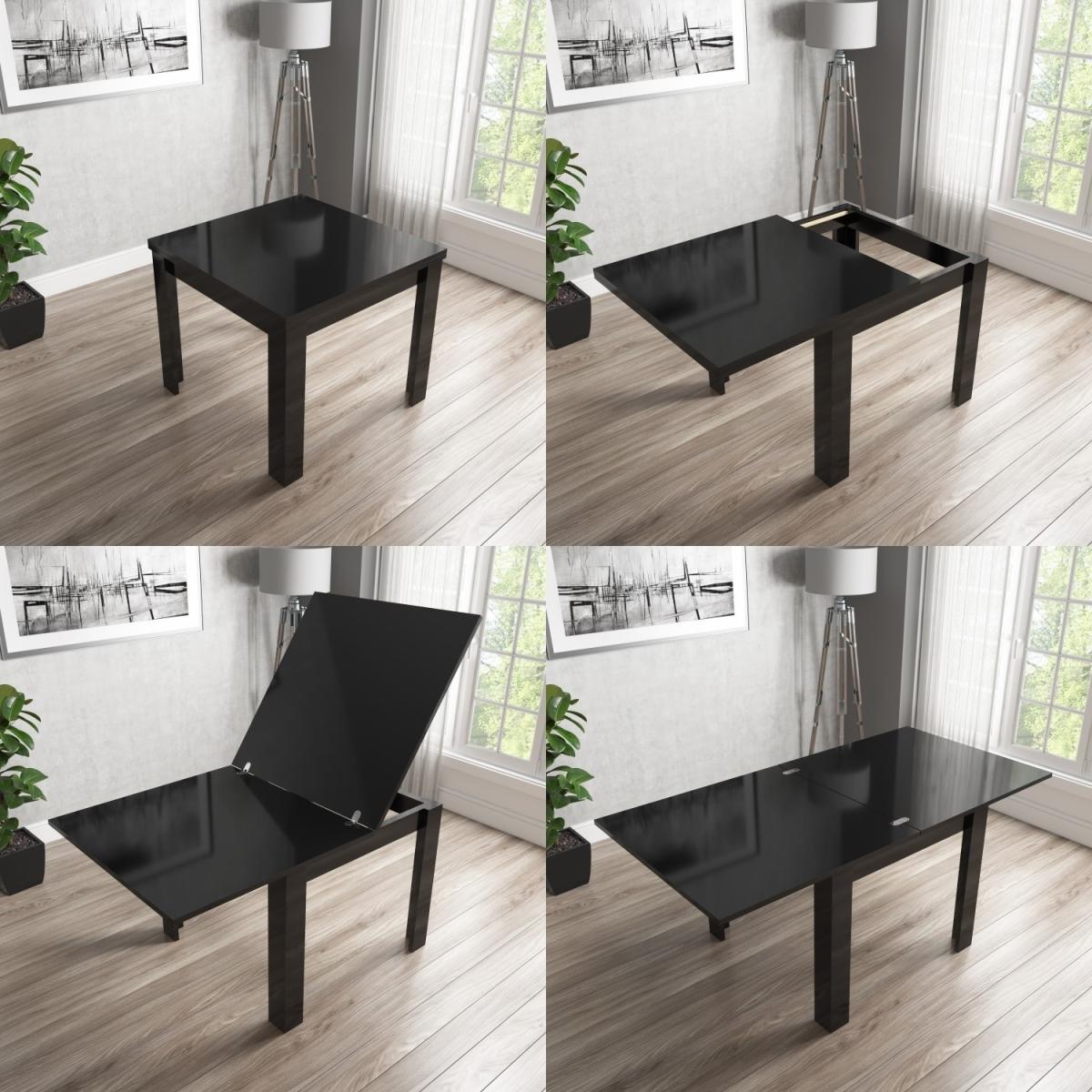 Features we love Ideal for 6 diners – folding design saves space when not in use. Quickly make extra dining space with the simple flip top mechanism. Clean design with a sleek finish adds a modern touch to the dining space Smooth high gloss finish – super easy to wipe clean. In jet black it easily coordinates with other dining furniture. Including just the table you're free to pair it with the chairs of your choice All about me. This contemporary Vivienne dining table has a hidden secret it features a clever table top design where the top simply flips over and extends the tables surface space to double the size. It comes in handy for increasing your dining space when guests come to call when the family are around for Sunday lunch or if you're simply serving up a feast and need more space for dishes. The table comfortably accommodates two diners when closed and when fully extended there's plenty of space for six diners. As it's neat and compact when closed it's great for saving space in your dining room or kitchen when it's not in use. The table comes on its own so you have the freedom to pair it with the chairs of your choice and the number that best suits your household. With a clean and linear design all in jet black the Vivienne table is super easy to coordinate with other dining furniture and many décor schemes. The sleek high gloss finish gives the table its own natural shine that reflects light beautifully plus the smooth nature of the table makes it super easy to wipe clean. Need to know. Dimensions (closed). H77 x W90 x D90 cm Dimensions (extended). H77 x W180 x D90 cm Size. 6 Diners Material. Wood combination Finish. Black high gloss Assembly required. Yes.