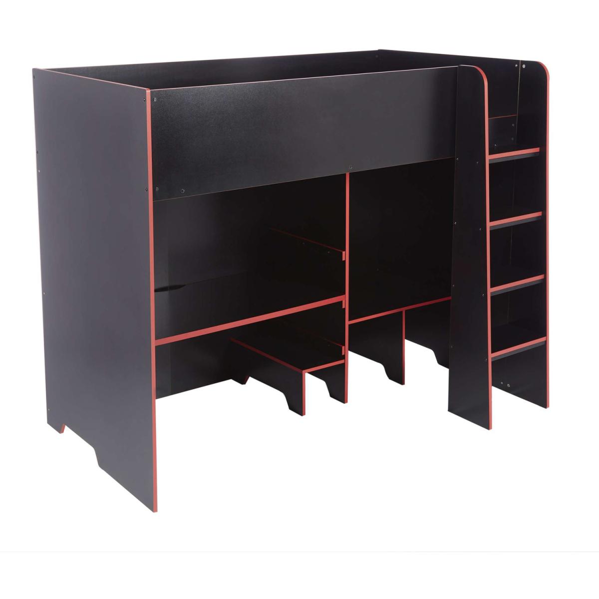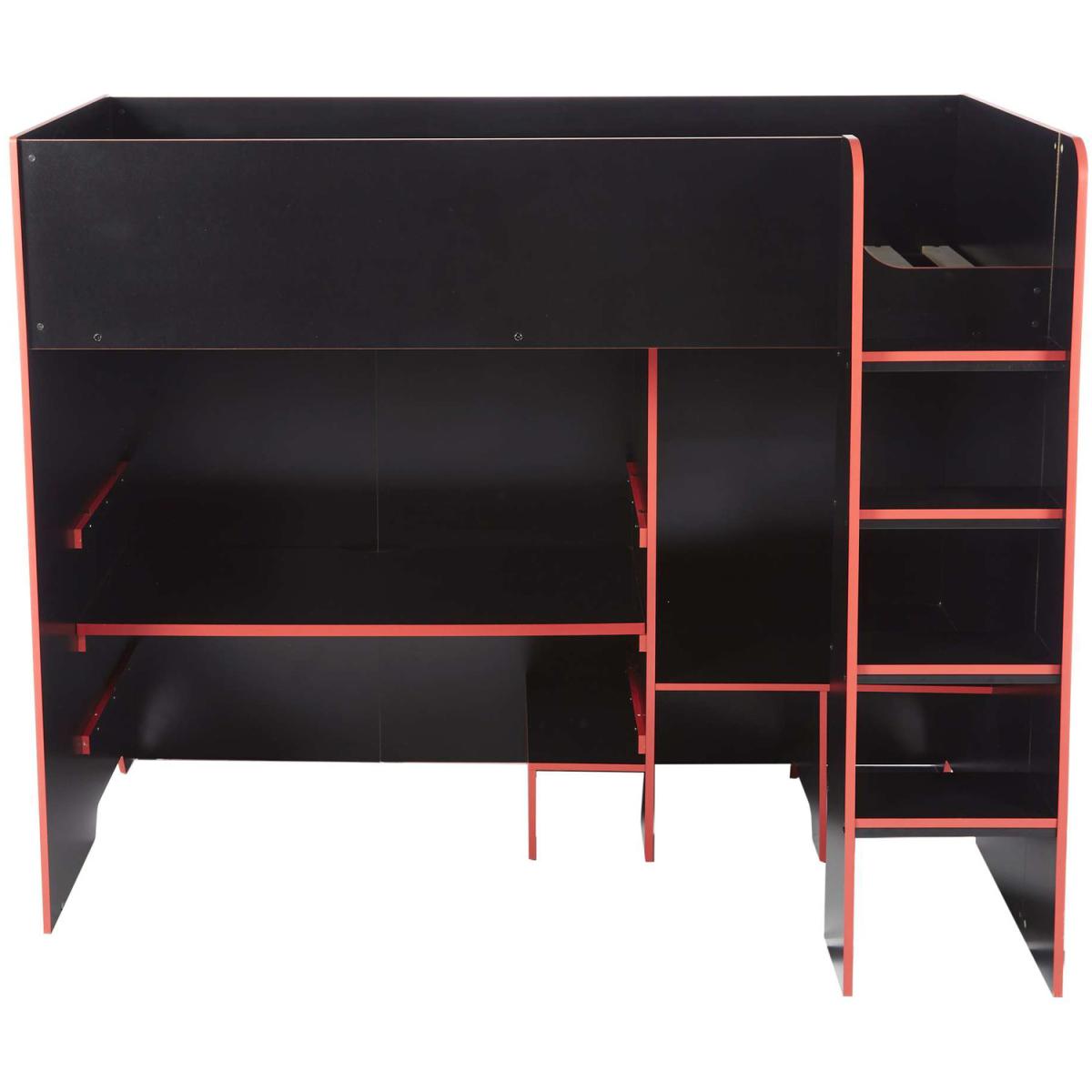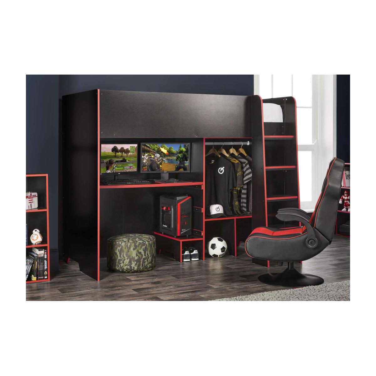 PDesigned for a great nightaposs sleep, the Virtuoso Gaming Elmer High Sleeper Gaming Bed lets you rest in style. Created with gamers in mind, the bunk bed style features incorporated storage shelves, a hanging rack and a spacious gaming desktop. The space-saving design combines your gaming experience with your bedroom essentials all in one place. Complete with a wide-step ladder, your child can climb in and out of bed with ease. Available in red or blue trims, your little gamer can maximise on their gaming style, storage and comfort with the Elmer sleeper. Maximum mattress depth is 20cm for a night of safe sleep.p