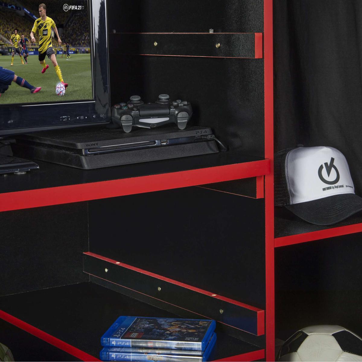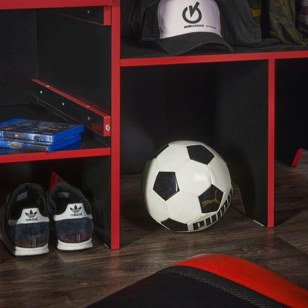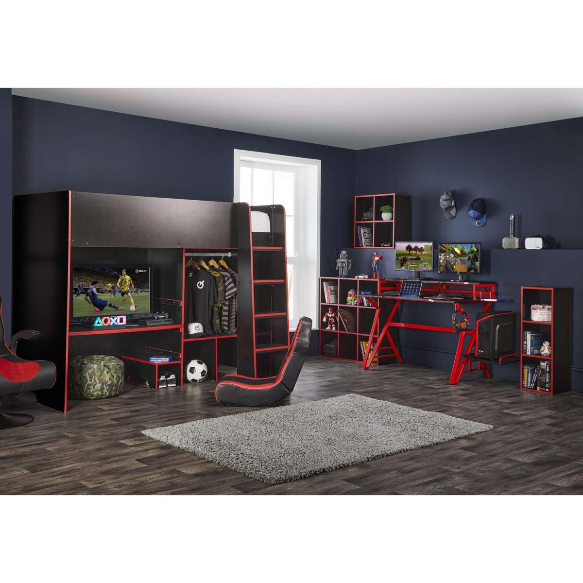 PDesigned for a great nightaposs sleep, the Virtuoso Gaming Elmer High Sleeper Gaming Bed lets you rest in style. Created with gamers in mind, the bunk bed style features incorporated storage shelves, a hanging rack and a spacious gaming desktop. The space-saving design combines your gaming experience with your bedroom essentials all in one place. Complete with a wide-step ladder, your child can climb in and out of bed with ease. Available in red or blue trims, your little gamer can maximise on their gaming style, storage and comfort with the Elmer sleeper. Maximum mattress depth is 20cm for a night of safe sleep.p