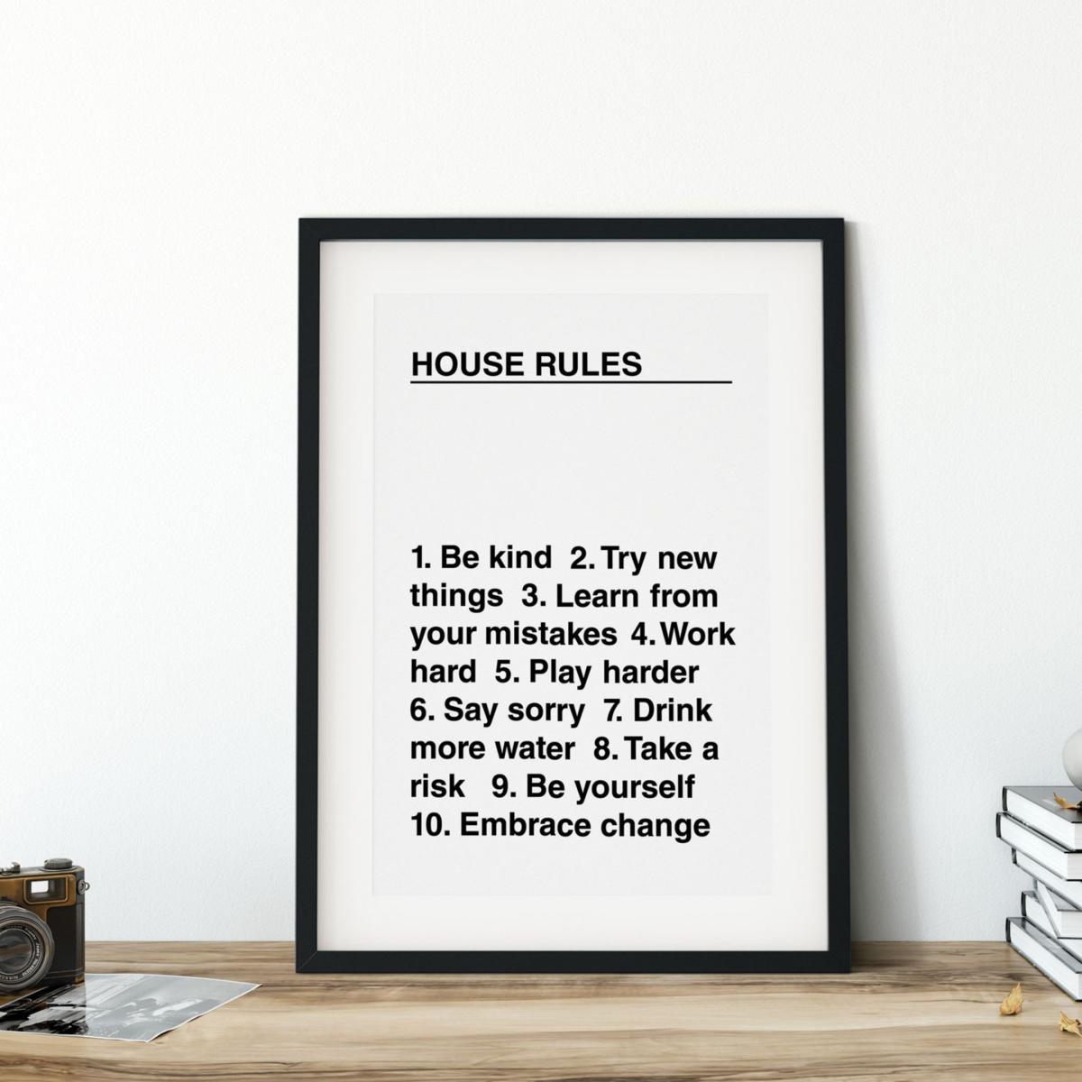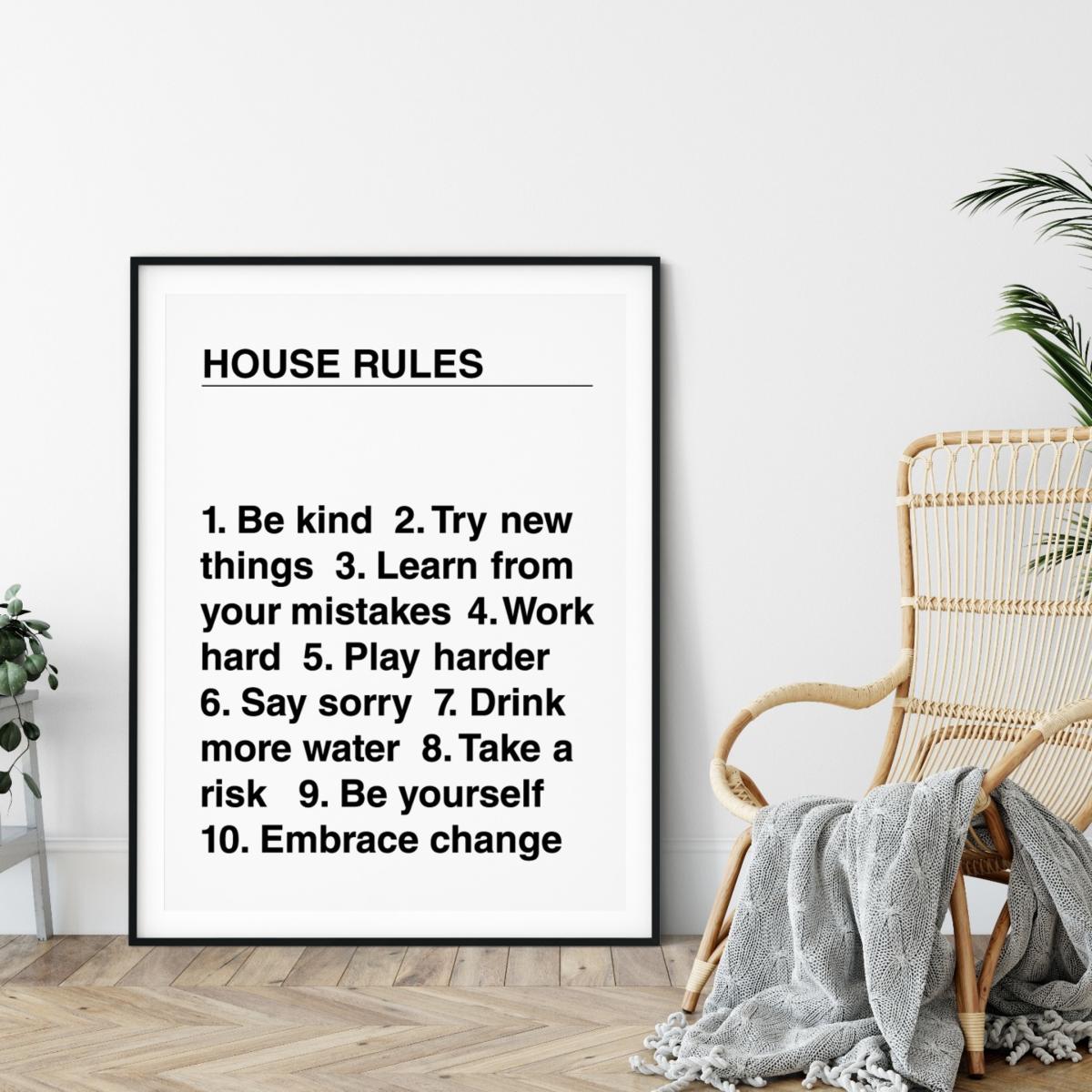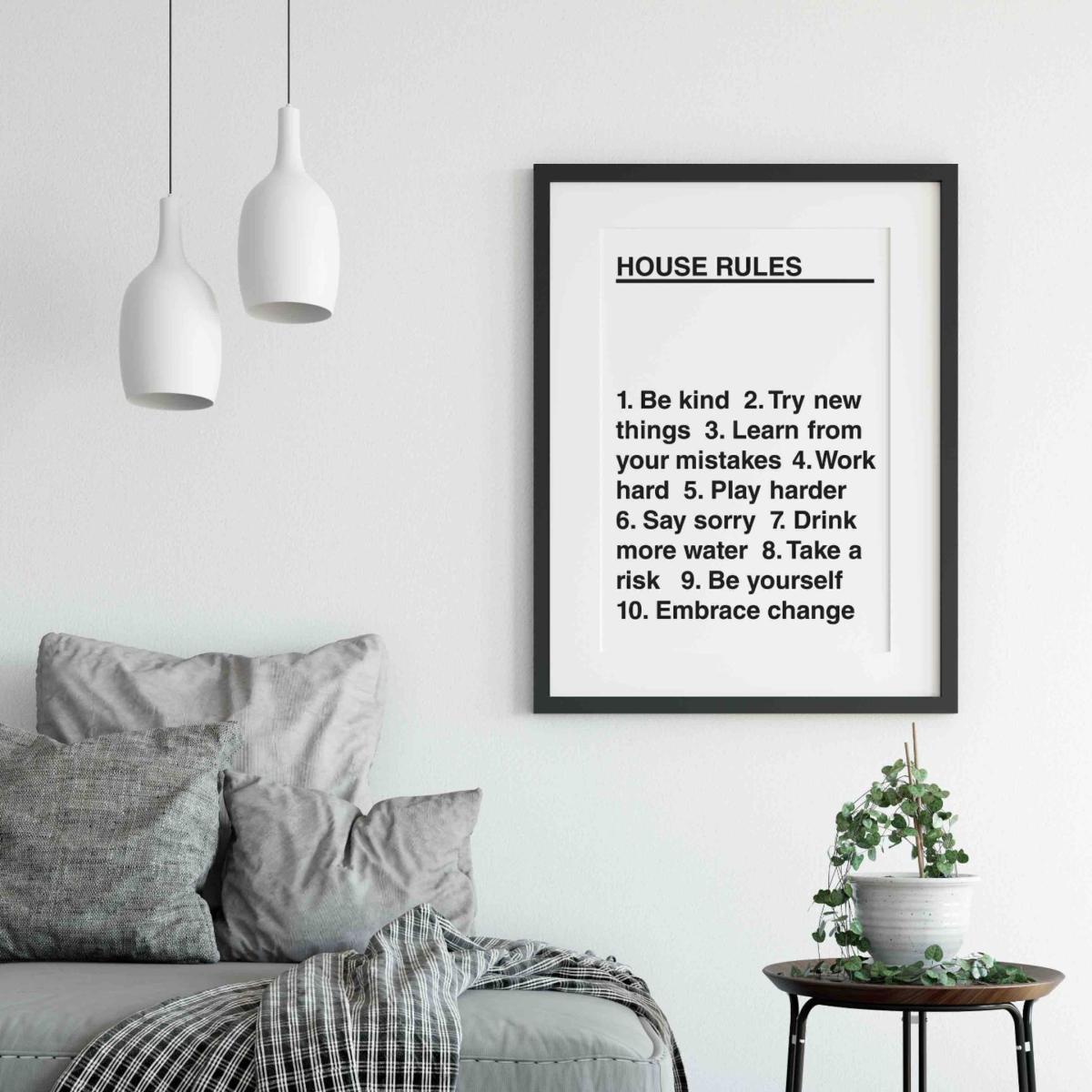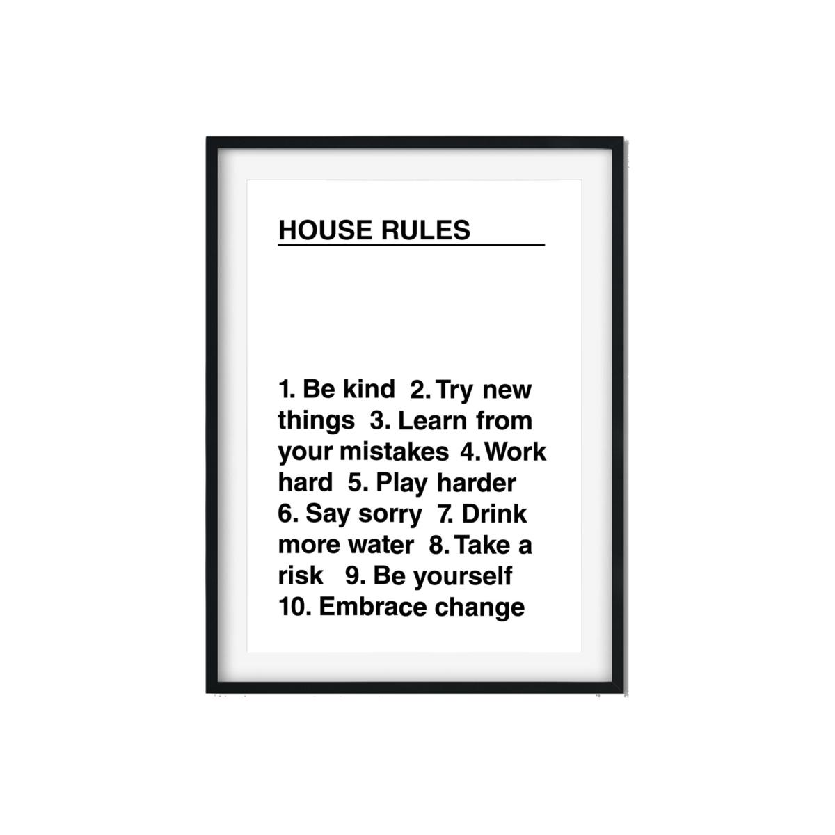 Get the family inspired for the week ahead with these daily rules to live by. A unique talking point for your living room, this black and white print aims to remind us to live life to the fullest. Even in the craziest of times, being the best version of ourselves is essential. Sold unframed. Printed on thick, museum-quality paper (250gsm) with high-quality ink to prevent fading.