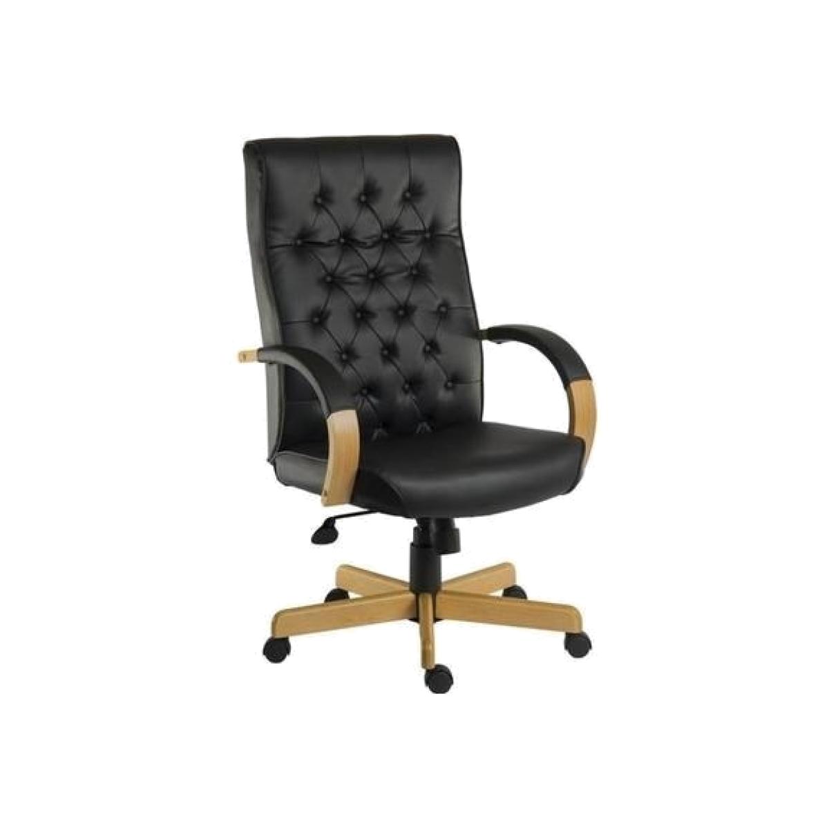 Dimensions. W53 x D51 x H111-121 cm About me This traditional styles executive bonded leather armchair with genuine button tufted backrest has a smart wooden base and matching padded armrests. It features a gas lift seat height adjustment and reclining function with tilt tension control so you can find a comfortable seating positio with ease. The luxurious bonded leather chair is a classy addition to any office space. Key features. Traditional bonded leather faced executive armchair. Button tufted backrest Light wood coloured arms and base. Gas lift seat height adjustment Reclining function with tilt tension. Simple self-assembly required..