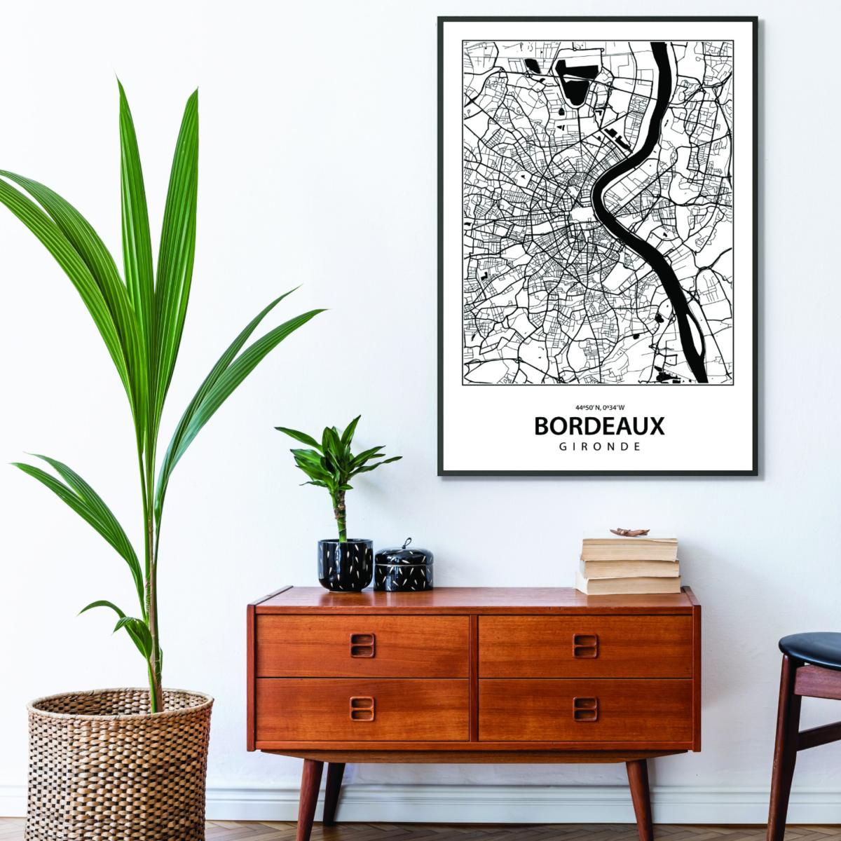The black map of Bordeaux extra large print is a great choice for adding a modern, sophisticated touch to contemporary or industrial interiors. I love how its monochrome palette makes it versatile enough for various colour schemes, particularly in monochromatic, minimalist, or urban-styled spaces. It works especially well in living rooms or home offices, where it can serve as a statement piece on a feature wall. Styling tips include pairing it with sleek black or metallic frames for a cohesive look, or layering it with other geographical or abstract artworks for visual interest. For practicality, hang it at eye level in well-lit areas to ensure the details are clearly visible and appreciated.