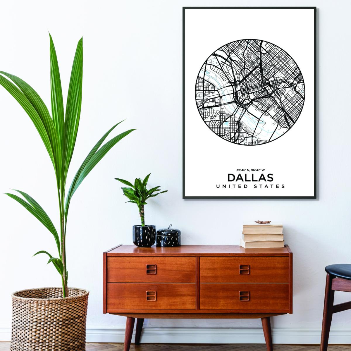 I really like this black map of Dallas - it’s a stylish, modern piece that works well in both contemporary and industrial interiors. Its monochrome palette makes it versatile, ideal for creating contrast against lighter walls or integrating into a minimal colour scheme. I recommend pairing it with sleek frames and placing it above a sideboard or in a gallery wall arrangement for added visual interest. This print is particularly effective in living rooms, home offices, or hallways where it can act as a subtle yet engaging focal point. Practical styling tip: keep surrounding decor simple to let the map stand out and consider floating it slightly away from the wall to emphasise its graphic nature.