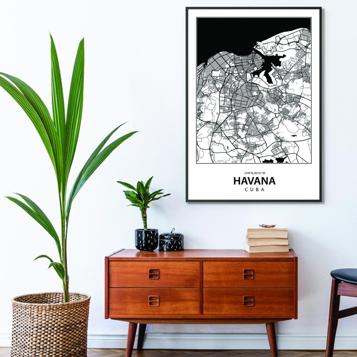 This black map of Havana is a stylish and modern piece that works well in contemporary or minimalist interiors, adding a touch of urban sophistication. I love how its monochrome palette allows it to be effortlessly integrated into various colour schemes, from neutral tones to bold statement walls. It’s also versatile enough to complement eclectic or industrial styles, especially when paired with other black and white accessories. For practical styling, consider framing it with a minimal border or mounting it on a coloured wall to make the map pop. It’s ideal for adding character to living rooms, home offices, or hallways, offering both visual interest and a conversational feature.