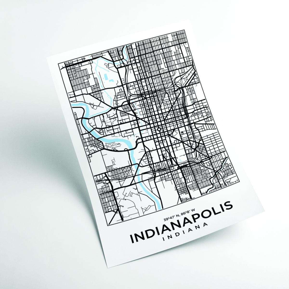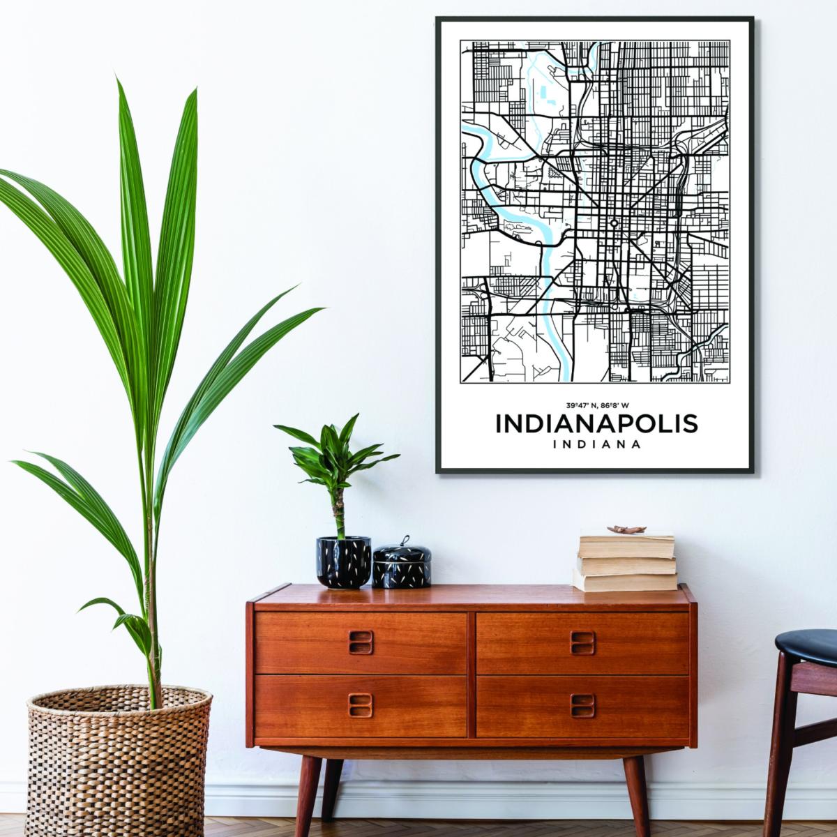 I love this print for its bold, minimalist aesthetic and urban appeal. The black map of Indianapolis works particularly well in contemporary or industrial interiors, providing a graphic focal point without overwhelming the space. It pairs beautifully with neutral palettes and can be styled alongside sleek furniture or exposed brick walls for a modern vibe. Practical styling tips include framing it with a slim black or white border for a clean finish, and displaying it above a console or sofa to anchor the room. This piece also works well in offices or entryways where a city-inspired touch adds personality without clutter.