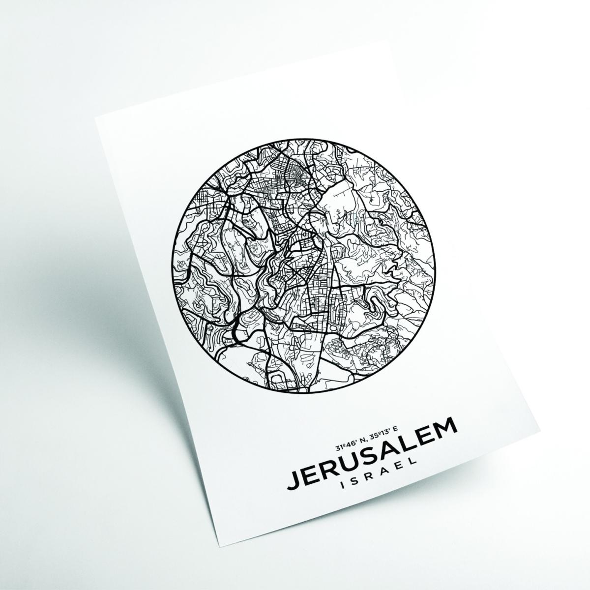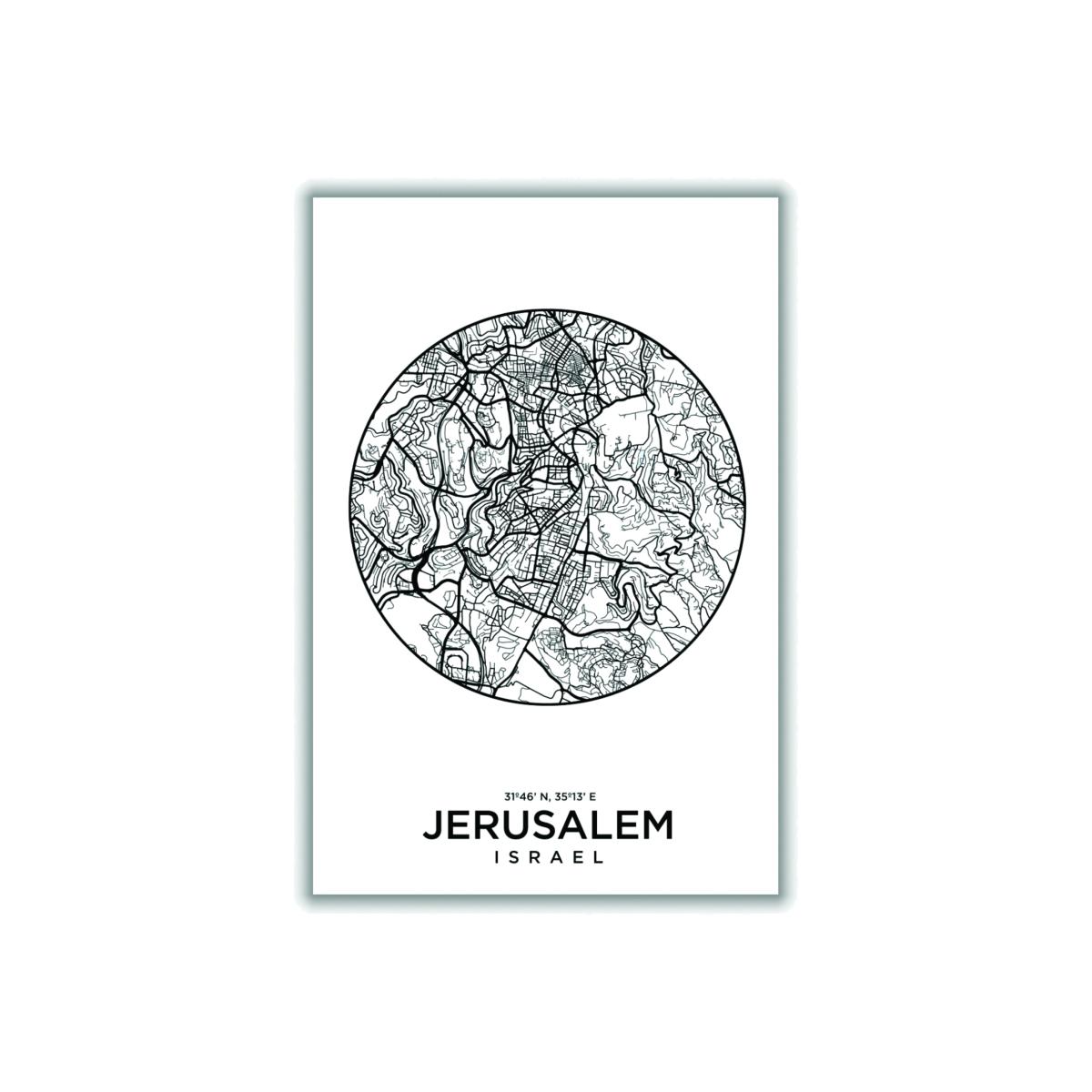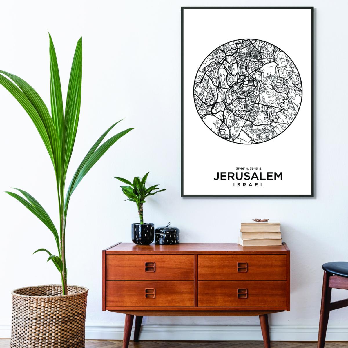 This map of Jerusalem is a striking piece that works well in contemporary or minimalist interiors, thanks to its monochrome palette and clean design. I love how it brings a sense of history and geography into a space without overwhelming it; perfect for a feature wall in a living room or study. Practical styling tips include framing it simply with a sleek glass or thin black frame to enhance its modern aesthetic, and pairing it with other black-and-white artwork or neutral accessories for a cohesive look. It’s versatile enough to complement both city-inspired interiors and more eclectic schemes, adding a subtle layer of personality and cultural context.