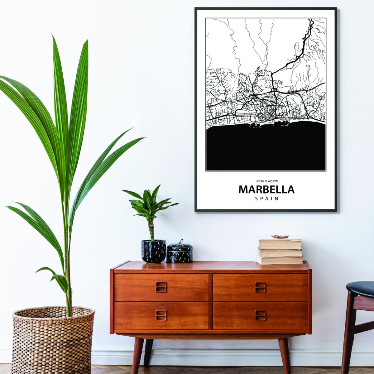 I love the black map of Marbella print because it has a modern, graphic appeal that works equally well in contemporary or industrial interiors. Its monochrome palette makes it versatile, pairing nicely with neutral colour schemes or contrasting bold furnishings. It’s ideal for adding visual interest without overwhelming a space - think above a sofa, in a home office, or in a hallway as a striking focal point. For styling tips, consider framing it in a sleek black or metallic surround to complement the dark tones, and keep surrounding decor minimal to let the print make a statement. It’s a smart choice for anyone looking to introduce a touch of urban sophistication with a hint of location-inspired charm.