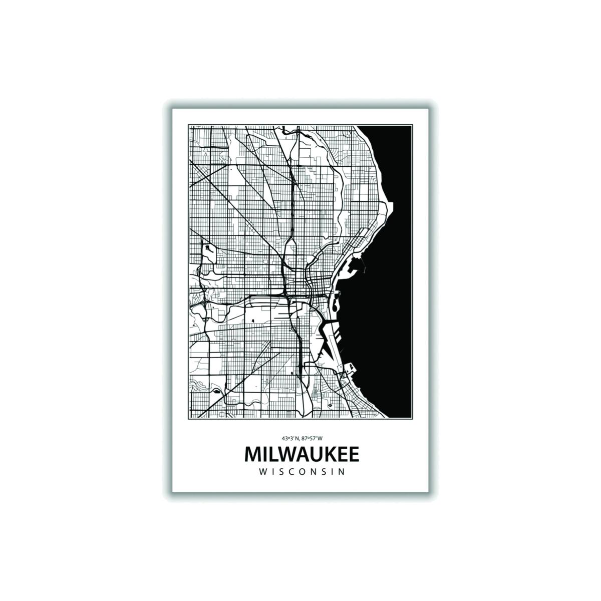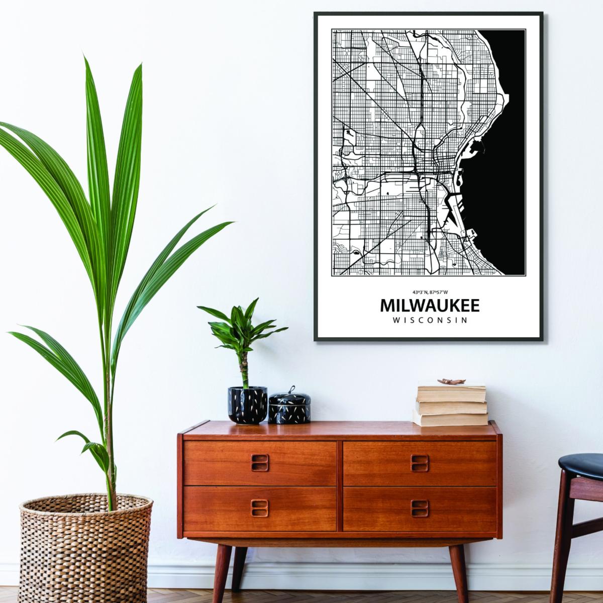 I love this map of Milwaukee because of its contemporary monochrome style - it adds a refined, urban touch to any space. It works particularly well in modern, minimalist, or industrial interiors, where its sleek black and white palette can be a focal point without overwhelming the room. For practical styling, consider placing it above a sofa or a sideboard, paired with other black and white artwork or minimal accessories to keep the look cohesive. It's also a great conversation piece for city lovers or those with a connection to Milwaukee, adding personality and a sense of place to your décor.