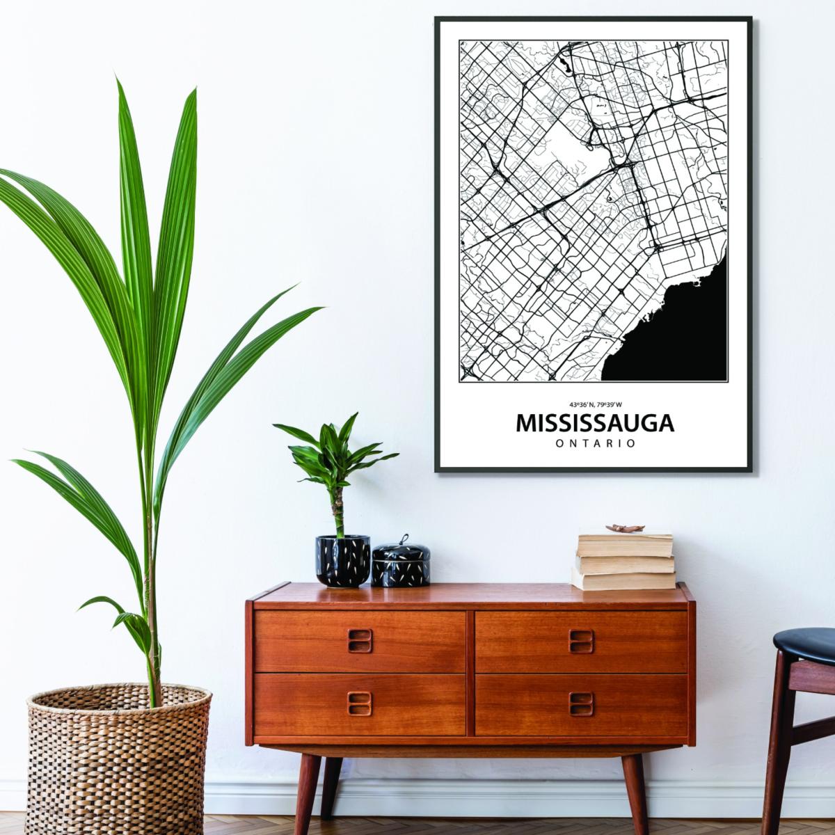 This black map of Mississauga is a sleek, modern piece that adds a contemporary edge to any interior. I love how its monochrome palette makes it versatile, working particularly well in minimalist or urban-inspired schemes. It’s perfect for creating a focal point above a desk or sofa, especially when paired with other black-and-white accessories or industrial accents. For practical styling, consider framing it simply to enhance its graphic quality or layering it with smaller prints for a gallery wall. This artwork is a smart yet understated way to bring personal relevance into communal or private spaces.