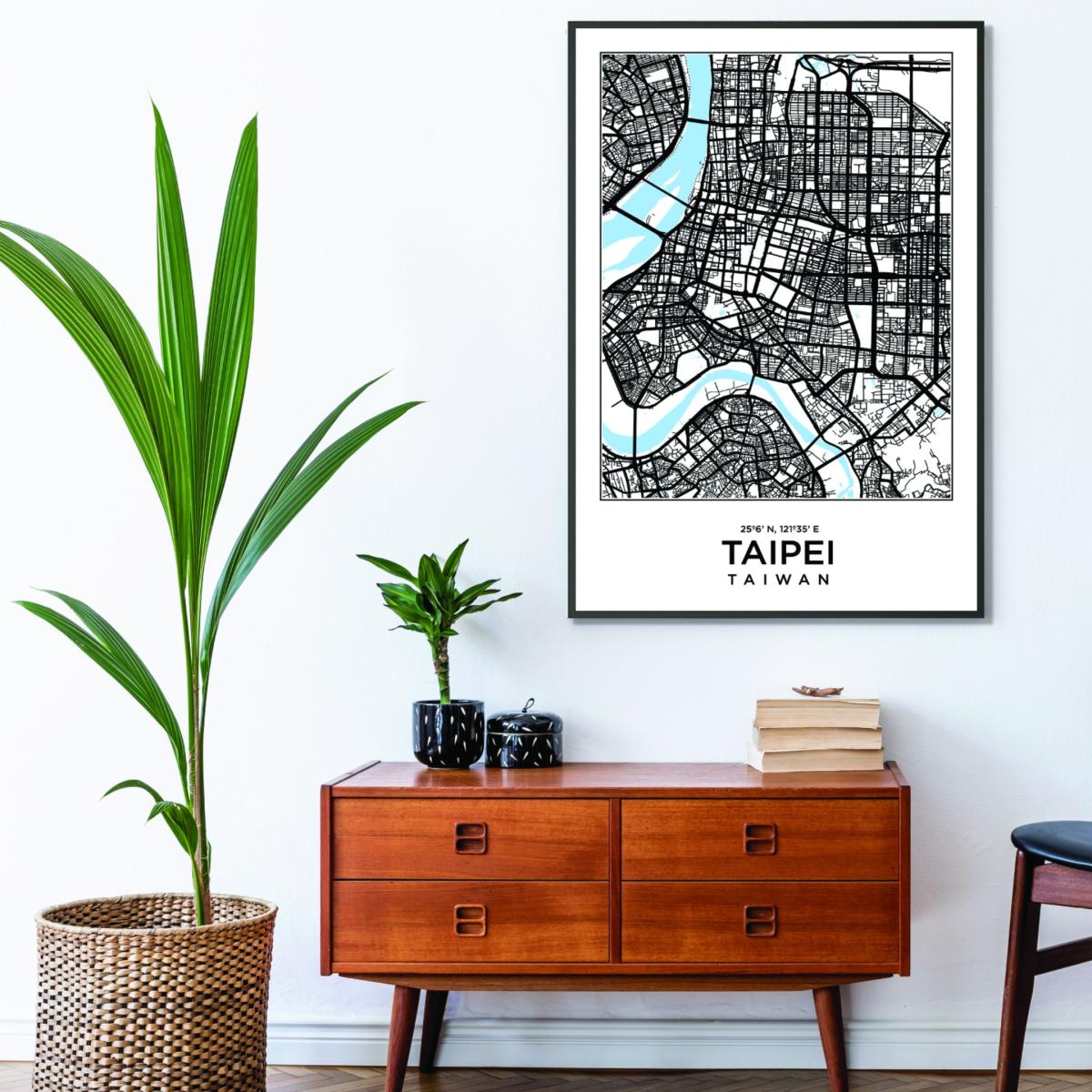I love the bold, monochrome aesthetic of the Black Map of Taipei - it makes for a striking focal point. It’s particularly well-suited to contemporary or minimalist interiors, where its clean lines and graphic style can really stand out. To style this piece effectively, consider pairing it with sleek furniture in neutral tones, allowing the map to be the main feature. It works great in living rooms, home offices, or even hallways, especially when complemented with subtle accents of colour that pick up on the blue in the map. For a more layered look, mount it with a simple mat and frame it in black or light wood to keep the modern vibe intact. This art piece not only adds visual interest but also celebrates the city in a sophisticated way.