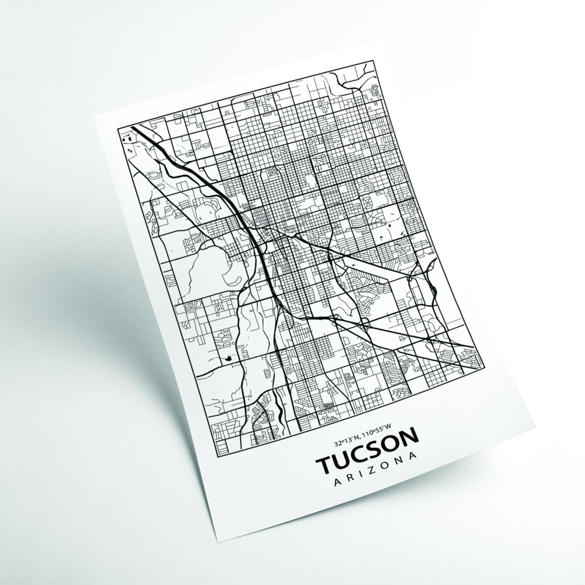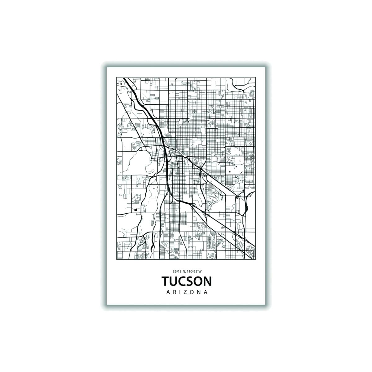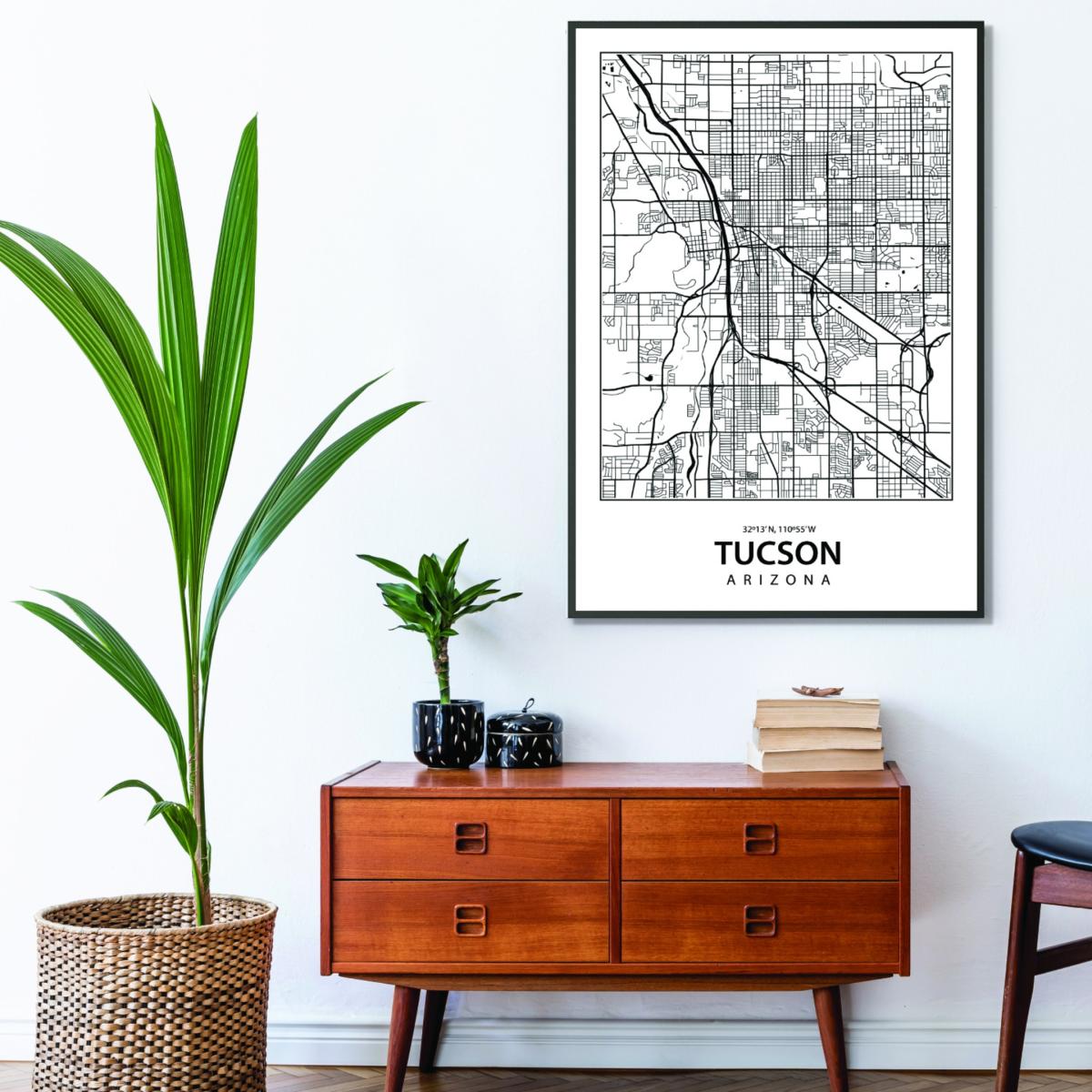 I love the black map of Tucson for its clean, modern aesthetic, making it a versatile piece that can fit into various interior styles. It works particularly well in contemporary and minimalist spaces, as its monochrome palette adds visual interest without overwhelming the room. For practical styling tips, consider pairing it with other black-and-white artwork or surroundings with metallic accents for a polished look. It also looks great in home offices or living areas where you want to bring in a touch of urban and geographical charm. Framing it simply in a slim black or white frame will keep the focus on the map while maintaining a sleek overall appearance.