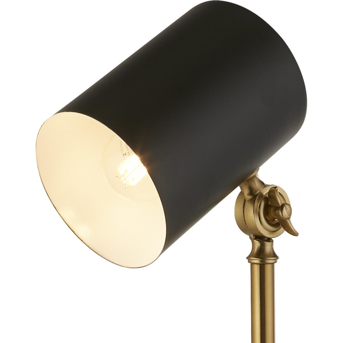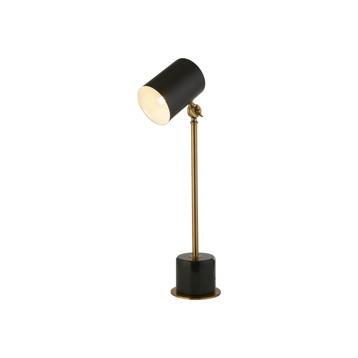 A modern take on the traditional angle poise desk lamp, this light is built on a sturdy black marble base. The gold frame has a moveable joint close to the black cylinder shade which means you can direct the light just where you need it.