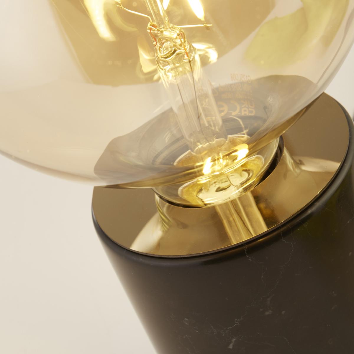 This unique table lamp will be a statement feature for any room. The dark marble base will suit any decor, and the amber glass LED filament bulb