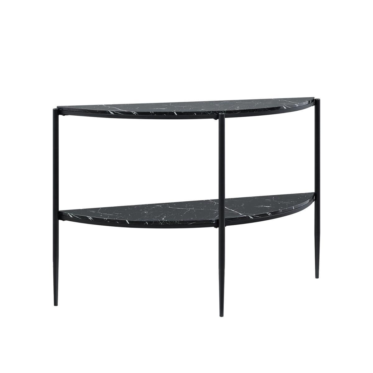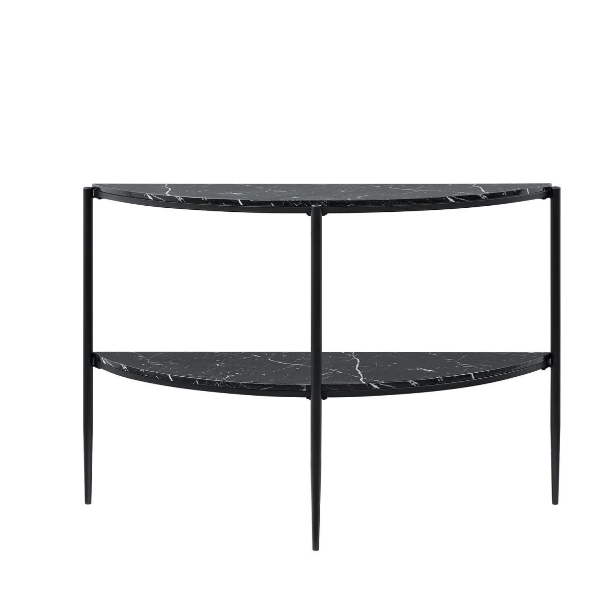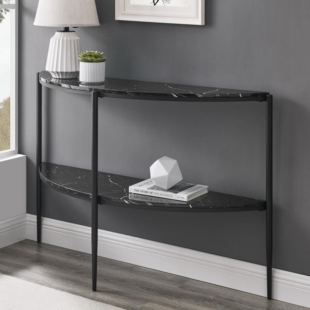 Small-space living is made modern and sleek by this half-circle entry table. The two spacious shelves lends surface space to house your keys, hats, scarfs or display décor or plants etc. Elegant, tapered legs help offer an instant contemporary upgrade to your home.
