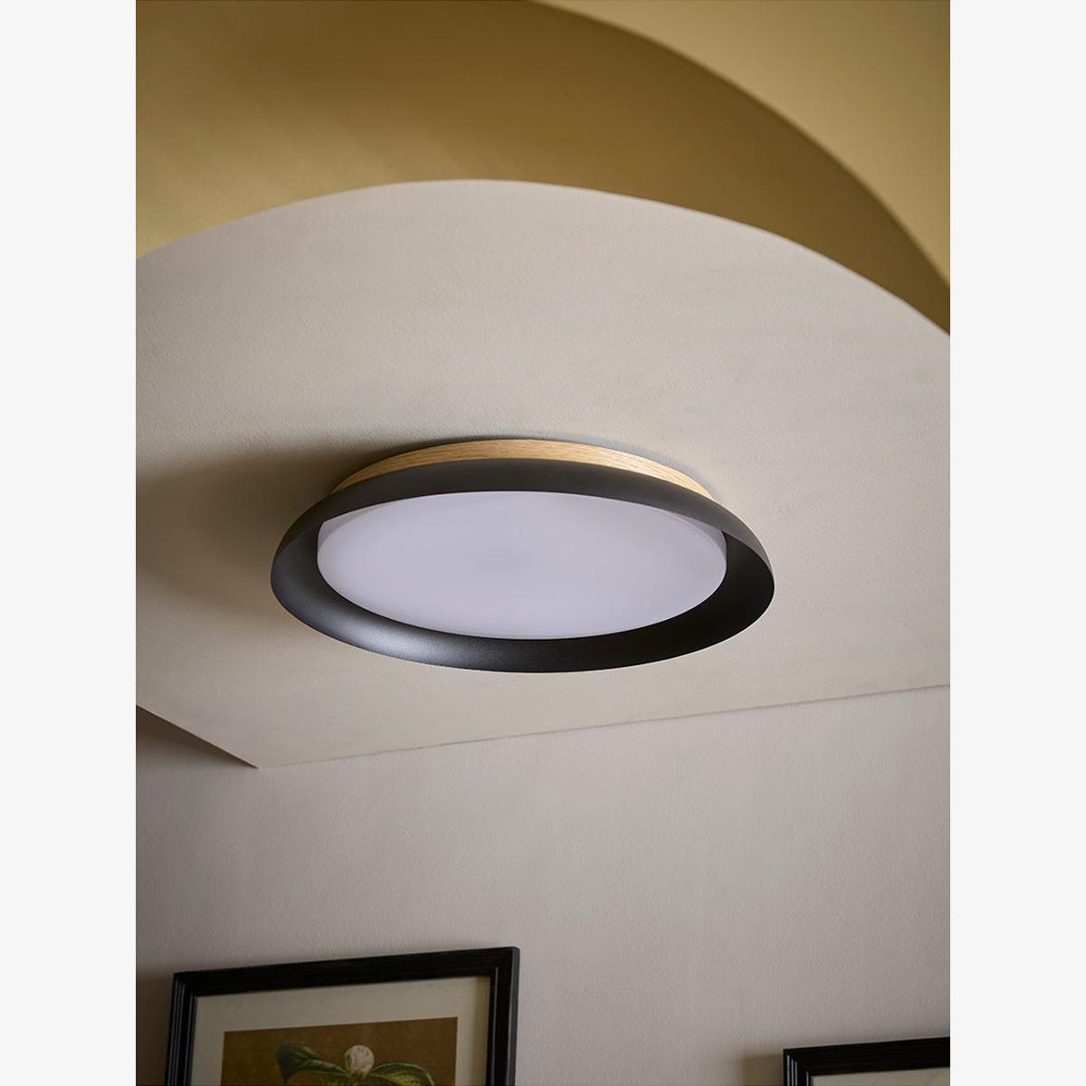 I really like this modern ceiling light because of its sleek combination of black metal and wood veneer, which adds a warm, natural touch to contemporary interiors. It works particularly well in minimalist or Scandinavian-style spaces, where its understated elegance can shine without overpowering the room. Practical styling tips include positioning it in living areas with neutral colour palettes to enhance its clean lines, or using it in bedrooms to create a calm, cosy atmosphere. Its low-profile design makes it versatile for lower ceilings, ensuring it provides good ambient light without overwhelming the space.