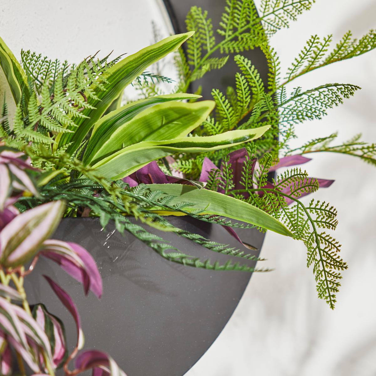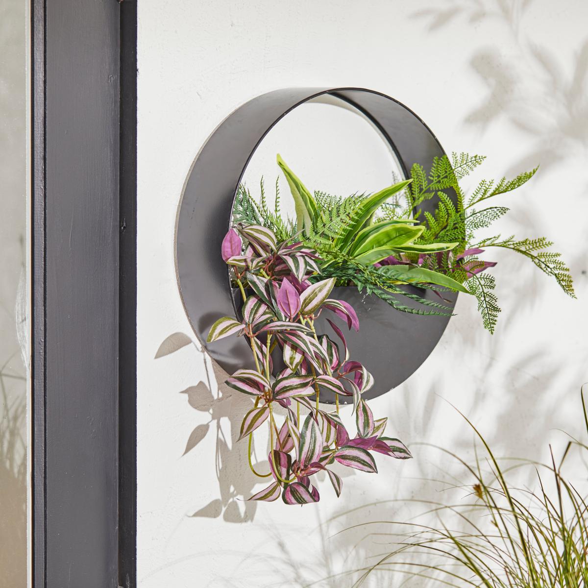 Featuring a lightweight black metal circle wall planter with foliage, perfect for displaying a beautiful flower arrangement in any indoor or outdoor space. Made from metal, this wall planter is potted with beautiful artificial foliage that will look great all year round and requires no maintenance. Its lightweight design allows comfortable hanging and it is suitable for indoor and outdoor use.