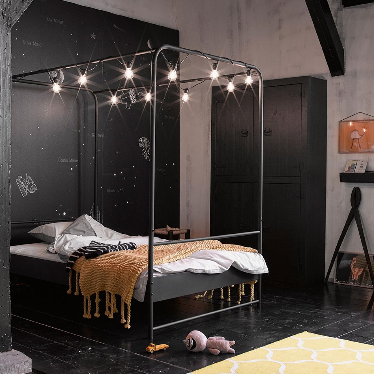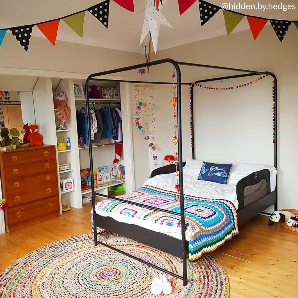 I love this black metal double four poster bed for its clean, minimalist look that works well in both modern and industrial interiors. Its sleek finish adds a touch of sophistication while remaining practical for a children's space. To style around it, consider adding colourful bedding or textured textiles to soften the monochrome palette, and complement with simple furniture pieces to keep the room feeling open. For a playful touch, hanging fairy lights or a canopy can add charm without cluttering the aesthetic. It’s versatile enough to grow with your child, offering a stylish statement that can be easily styled for different themes or colour schemes.