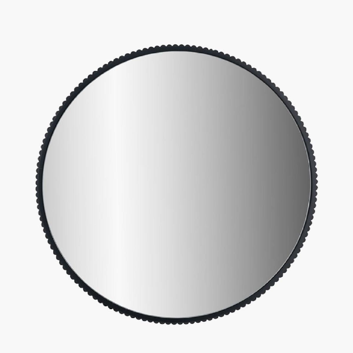 70cm round wall mirror, featuring a matte black metal frame with a textured edge. 70cm round wall mirror, featuring a matte black metal frame with a textured edge.