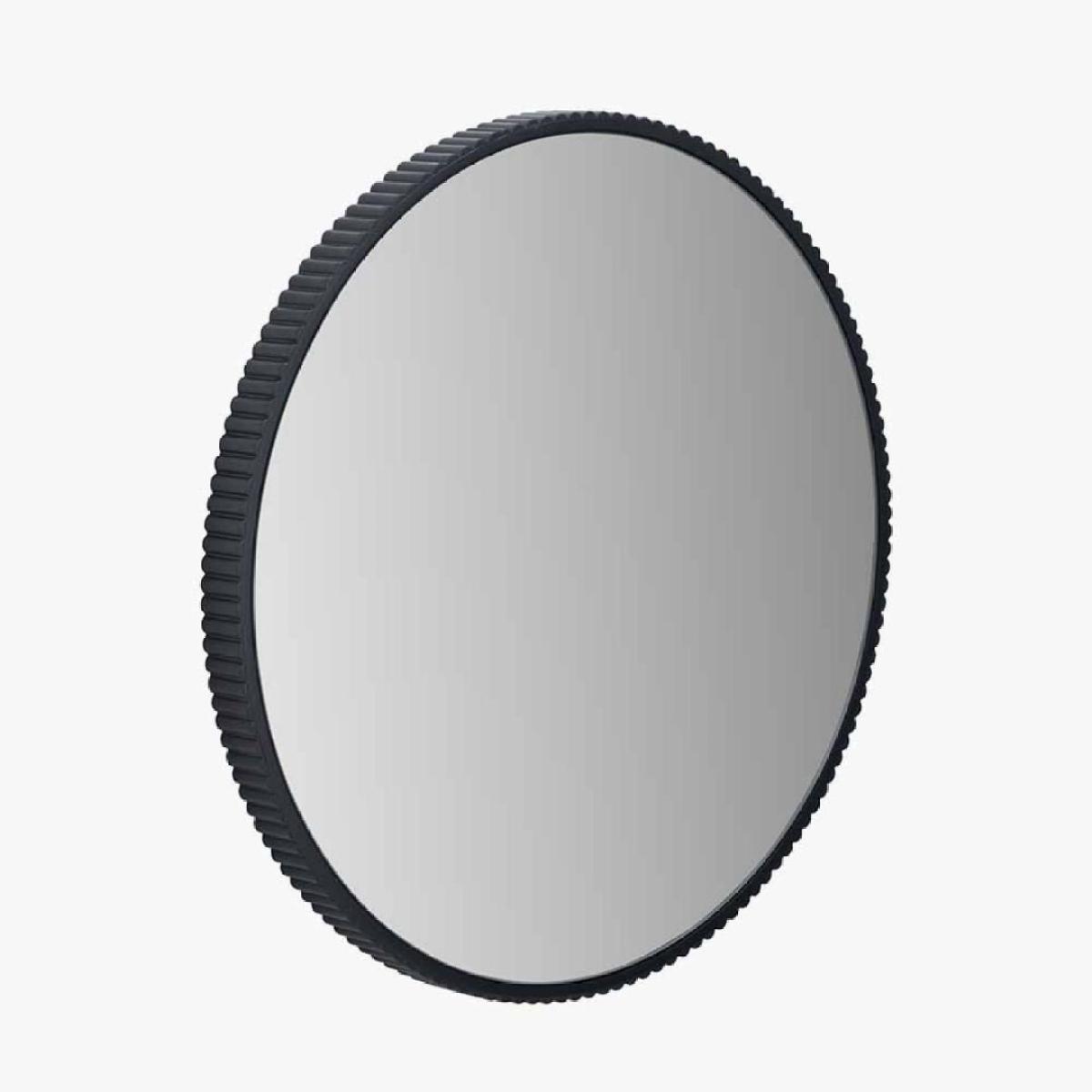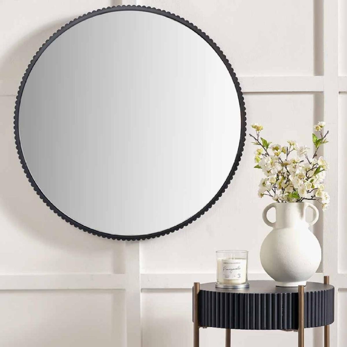 I really like this round mirror for its sleek, minimalist appeal and the textured black metal border adds a nice tactile detail without overwhelming the design. It works particularly well in contemporary, industrial, or monochrome interiors, giving a modern edge while also offering a subtle contrast in softer, more muted schemes. Practical styling tips include hanging it above a console table or alongside other monochrome accessories to create a focal point. For a touch of sophistication, try layering with smaller wall art or placing decorative objects like candles or plants beneath it to enhance the overall aesthetic. Its versatile design makes it suitable for living rooms, bedrooms, or entryways, adding both light reflection and visual interest to any space.