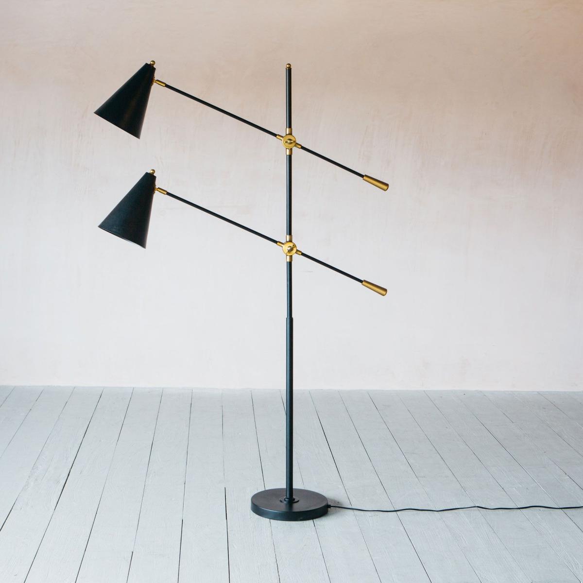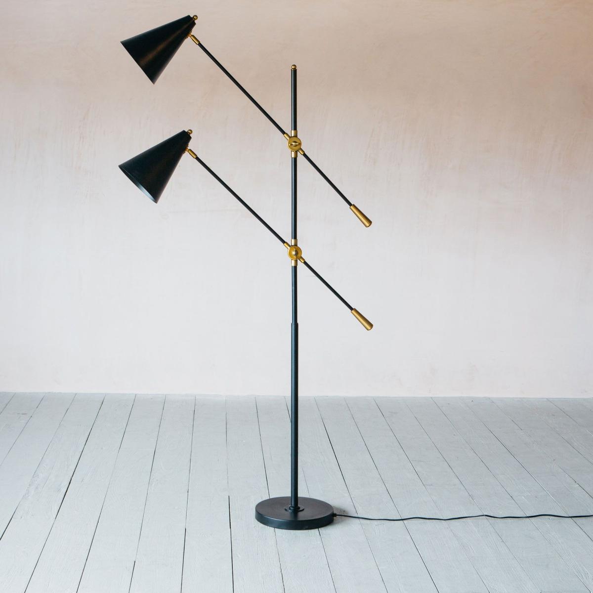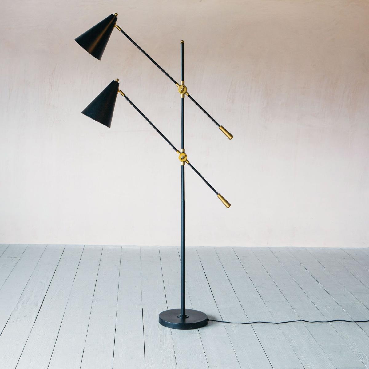 A contemporary multi-headed floor light crafted from iron with a matte black finish and brass detailing. Slim-line, stylish and fully adjustable, this retro-inspired lamp is perfect for those cosy corners.
