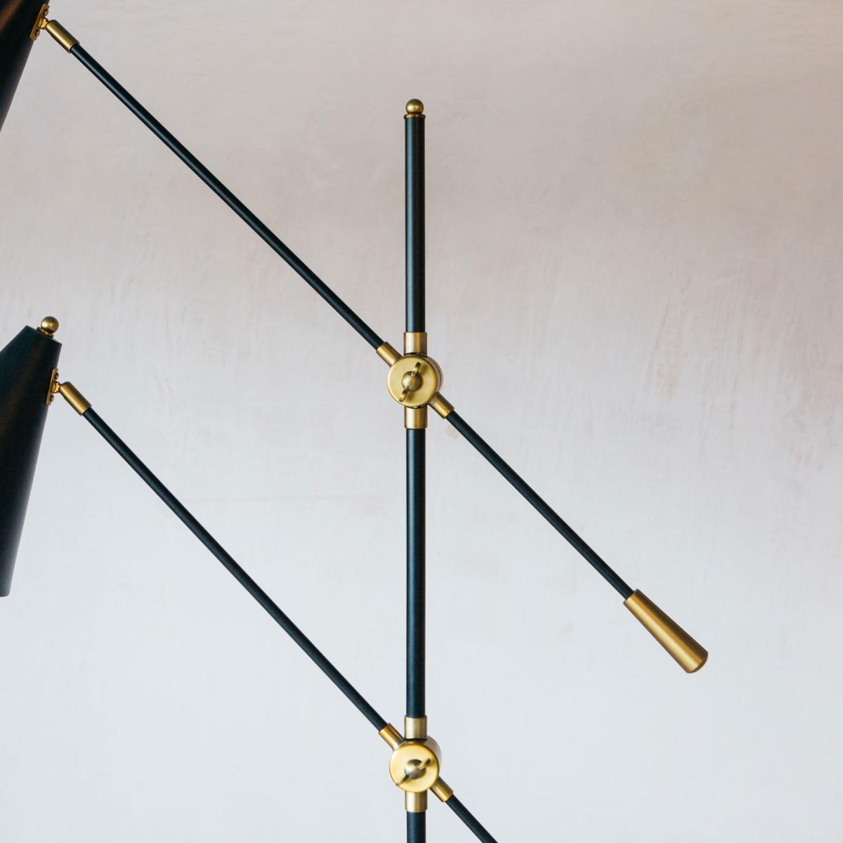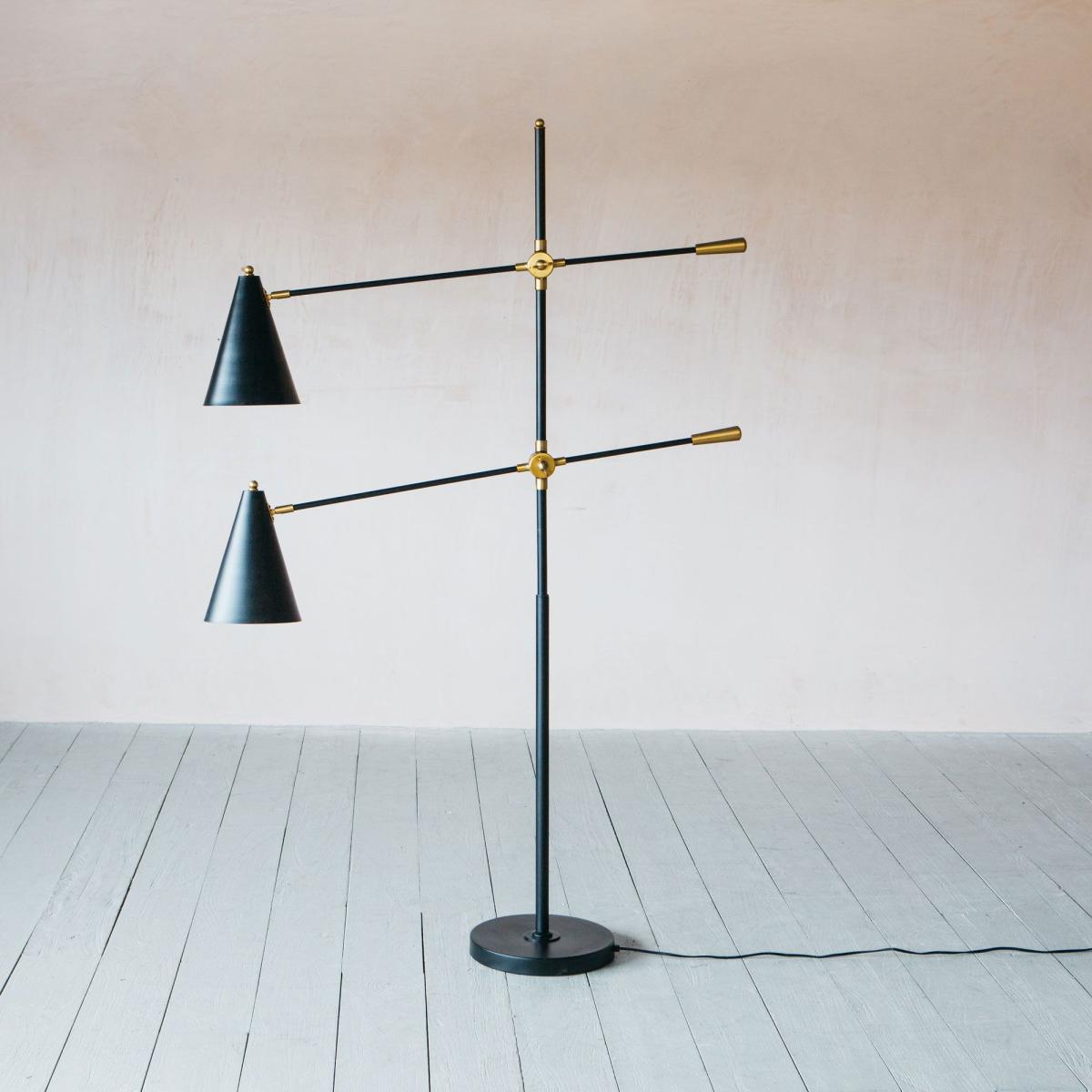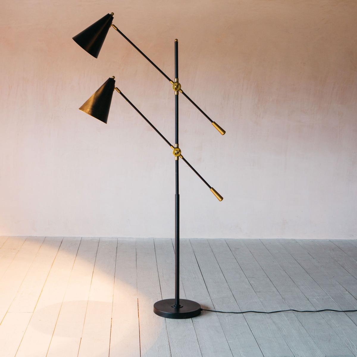 A contemporary multi-headed floor light crafted from iron with a matte black finish and brass detailing. Slim-line, stylish and fully adjustable, this retro-inspired lamp is perfect for those cosy corners.