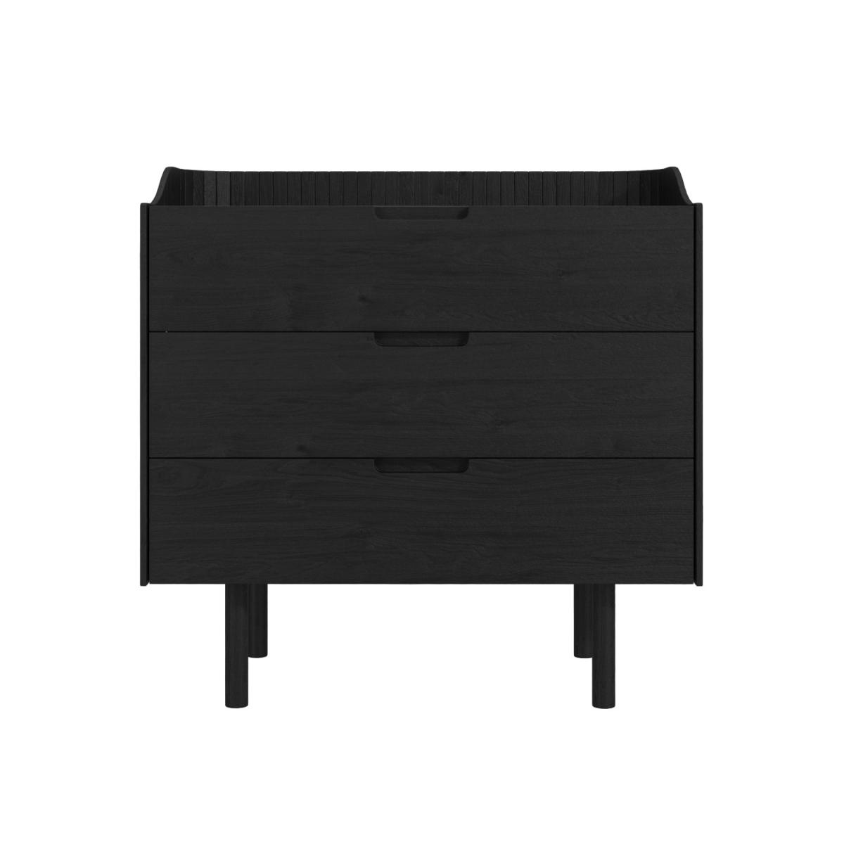 Features we love Mid-century design chest with 3 cutout handle drawers Ideal for storing folded clothes and other essentials Statement piece finished with a curved ribbed collar Solid ash wood and blackened veneer oozes Scandi style Complete the look with the matching retro Saskia range All about me Add a Scandi-inspired touch of retro to your bedroom with the Saskia chest of drawers. It features a lacquered blackened wood finish and a ribbed collar detail. The drawers are perfect for stowing away your clothing and accessories, and they feature metal runners for a smooth opening and closing. Need to know Dimensions: W80 x D45 x H85 cm Packaging dimensions:W89 x D54 x H74 cm Drawer dimensions:W70 x D27 x H10.5 cm Number of drawers: 3 Weight: 38.5 kg Colour:Black wood Finish:Nitrocellulose lacquer Material: Solid ash wood and blackened ash veneer Runners: Metal Assembly required: Yes – just attach the legs