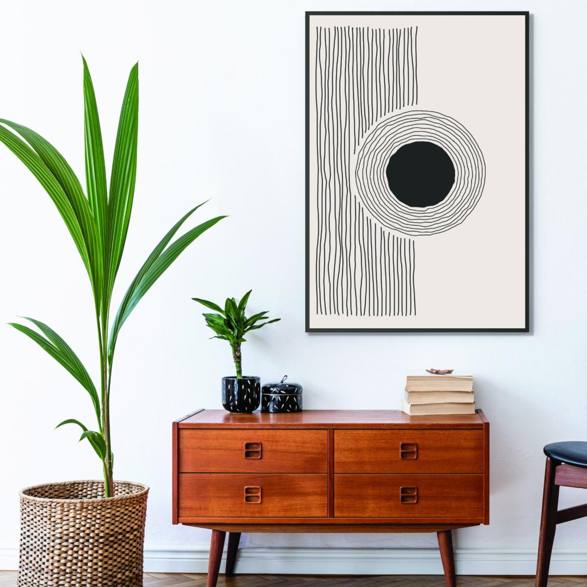 The black minimal circle large Stanley print house is a versatile piece that works especially well in modern or contemporary interiors. Its monochrome palette and simple geometric design make it ideal for creating a focal point in a living room, bedroom, or even a minimalist office. I love how it adds visual interest without overwhelming the space; it can effortlessly complement neutral palettes or serve as a striking contrast in more eclectic schemes. Practical styling tips include pairing it with sleek, understated frames or hanging it above a console or sofa for maximum impact. To keep the look cohesive, consider pairing it with other black and white accessories or textured elements to add depth to your decor.
