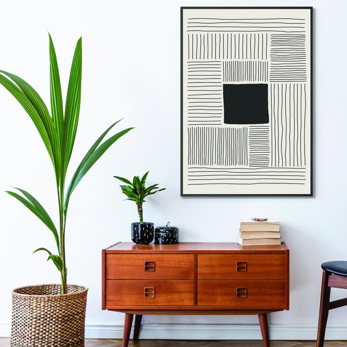 I really like this black minimalism print for its clean, graphic appeal. It works particularly well in contemporary or pared-back interiors where its bold geometric lines can add visual interest without overwhelming the space. It’s versatile enough to slot into a variety of colour schemes - especially monochrome or neutral palettes - and pairs well with sleek furniture and natural textures. For styling, I’d recommend placing it above a console table or sofa with simple, understated accessories to let the artwork stand out. It’s a great choice for adding a sophisticated touch to living rooms, offices, or bedrooms that benefit from calm, organised aesthetics.