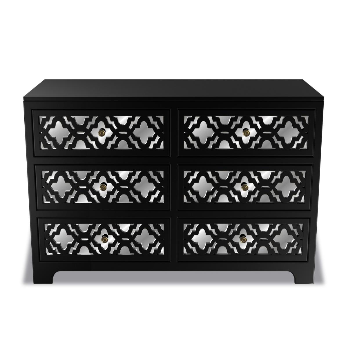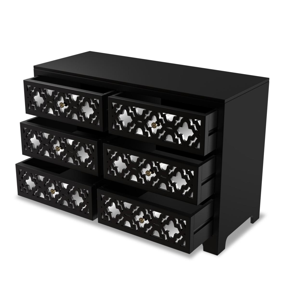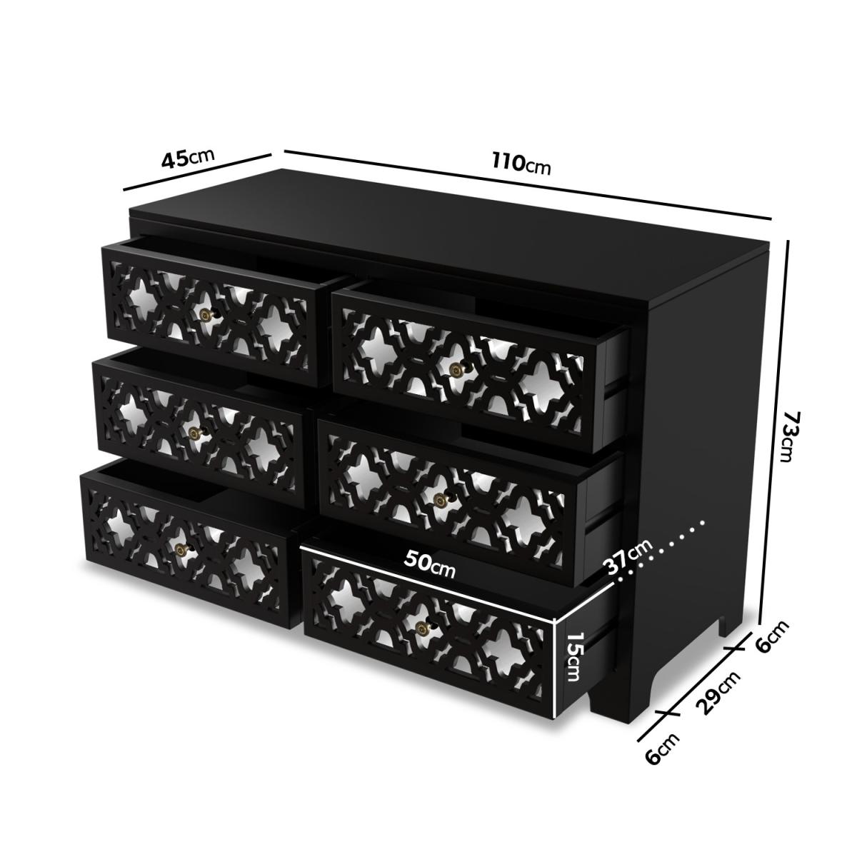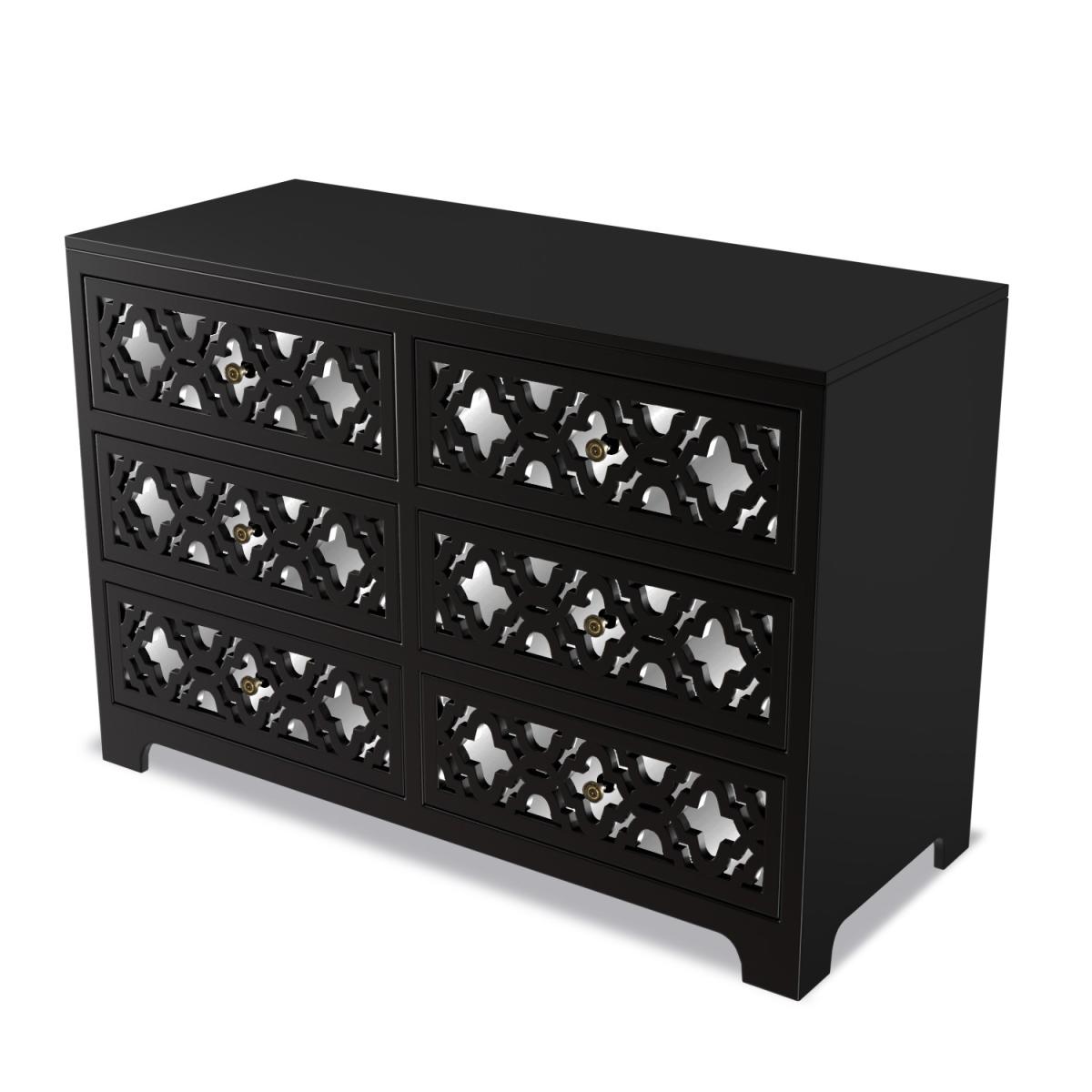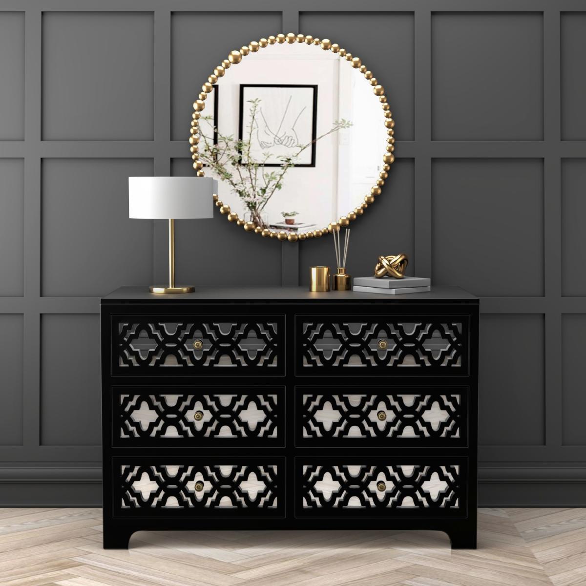 Stunning chest of 6 drawers made from solid mango wood Moroccan-inspired fretwork is mounted on mirrored panels Painted black finish adds a touch of elegance to any bedroom Arrives fully-assembled with six spacious drawers Makes a great statement piece - a talking point in any room Need to know Finish:Black and mirrored Material: Solid mango wood Assembly required: No