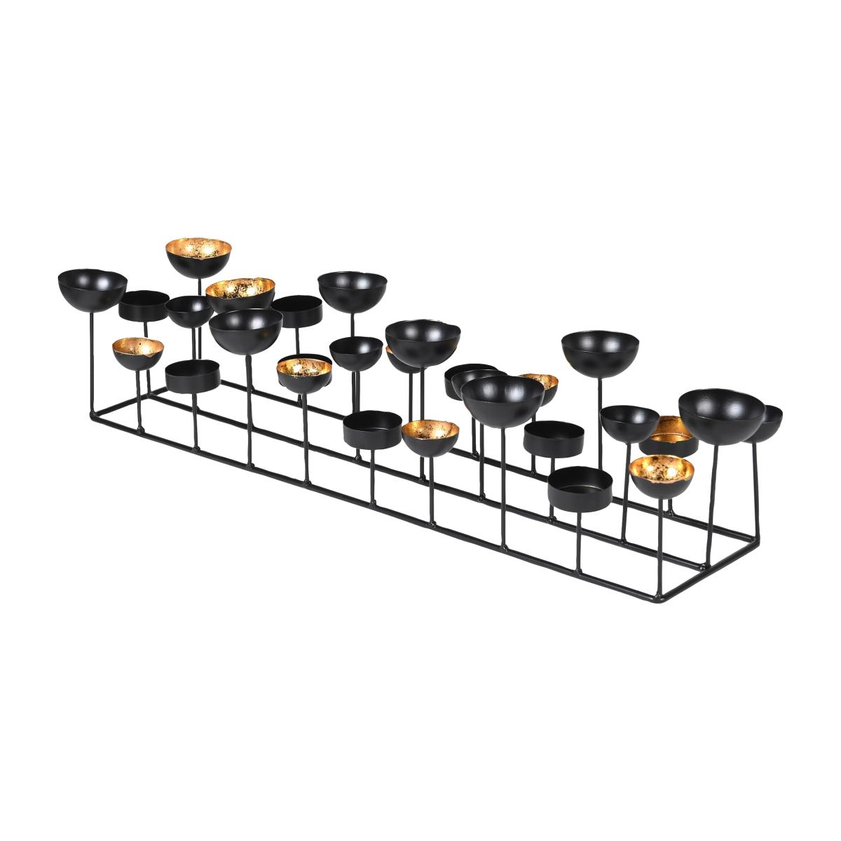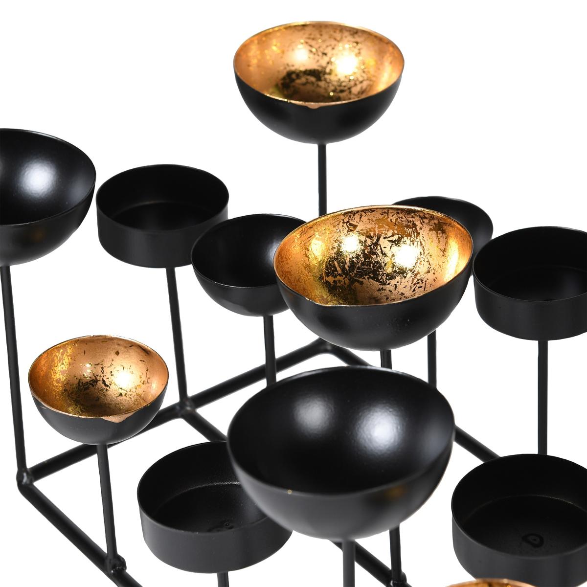 The Black Multi Cup Tealight Holder is a stunning way to light up your dining table, whatever the occasion. Featuring nine tealight holders and multiple decorative cups at various heights all in a black and gold metallic finish. Ideal to add cohesion and contrast in equal measures to your decorating scheme.