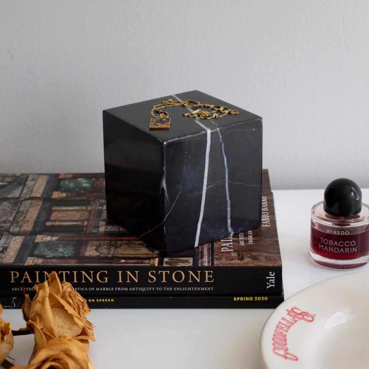 I love the black marble cube for its sleek and modern look, making it a versatile piece for various interiors. It works particularly well in contemporary or minimalist spaces where it can add a touch of sophistication. To style it effectively, consider pairing it with neutral or monochrome colour schemes to keep the focus on its elegant material or use it as a statement piece on side tables, shelves, or console units. Practical tips include combining it with other natural textures like wood or metal to create a balanced aesthetic. Its clean lines and striking material make it a great option for both decorative purposes and as a subtle conversation starter in your space.
