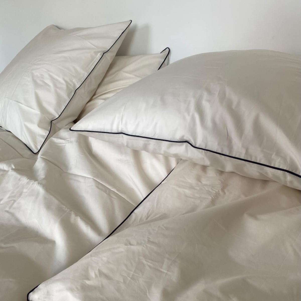 'Canvas' percale framed with 'Cinder' piping. Slightly rounded at the corners with concealed biodegradable coconut shell buttons and internal corner ties.  Cool and Crisp, our 300 thread count percale is made in India from 100% organic, Global Organic Textile Standard and Fairtrade certified cotton.
