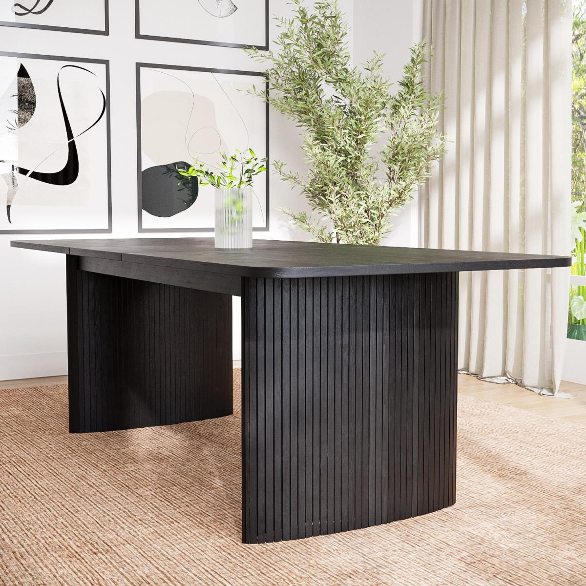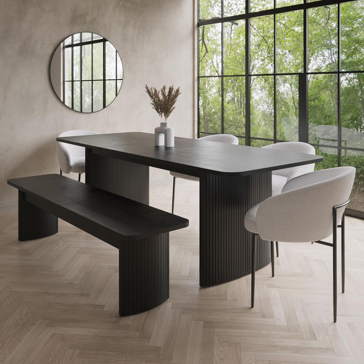 This bundle includes: 1 x Black Oak Extendable Dining Table - Jarel 4 x Cream Boucle Dining Chairs - Cora 1 x Black Oak Large Dining Bench - Jarel Care instructions - Please use heat-protective mats & coasters when placing food & hot/cold drinks onto the table to protect the natural oak wood, clean up any spills straight away as oak wood is porous and will absorb liquids. Features we love Extendable dining table with textured legs Contemporary curved table suits any dining room Modern boucle dining chairs with curved back Unique black metal frame that creates contrast Extra large wooden dining bench to seat three people Need to know Dining Table Information Dimensions:H75 x W180 x D90 cm Extended dimensions:H75 x W220 x D90 cm Seats:Up tp 8 Material:Blackened oak veneer and solid oak Finish:Lacquered Assembly required:Yes Dining Chair Information Number of chairs: 4 Dimensions: W60 x D58 x H75 cm Material: Boucle fabric and metal legs Finish: Boucle seat with sleek black legs Assembly required: Yes Range: Cora Dining Bench Information Dimensions: W180 x D38 x H45 cm Material: Oak and oak veneer Finish: Lacquered Assembly required: Yes Range: Jarel