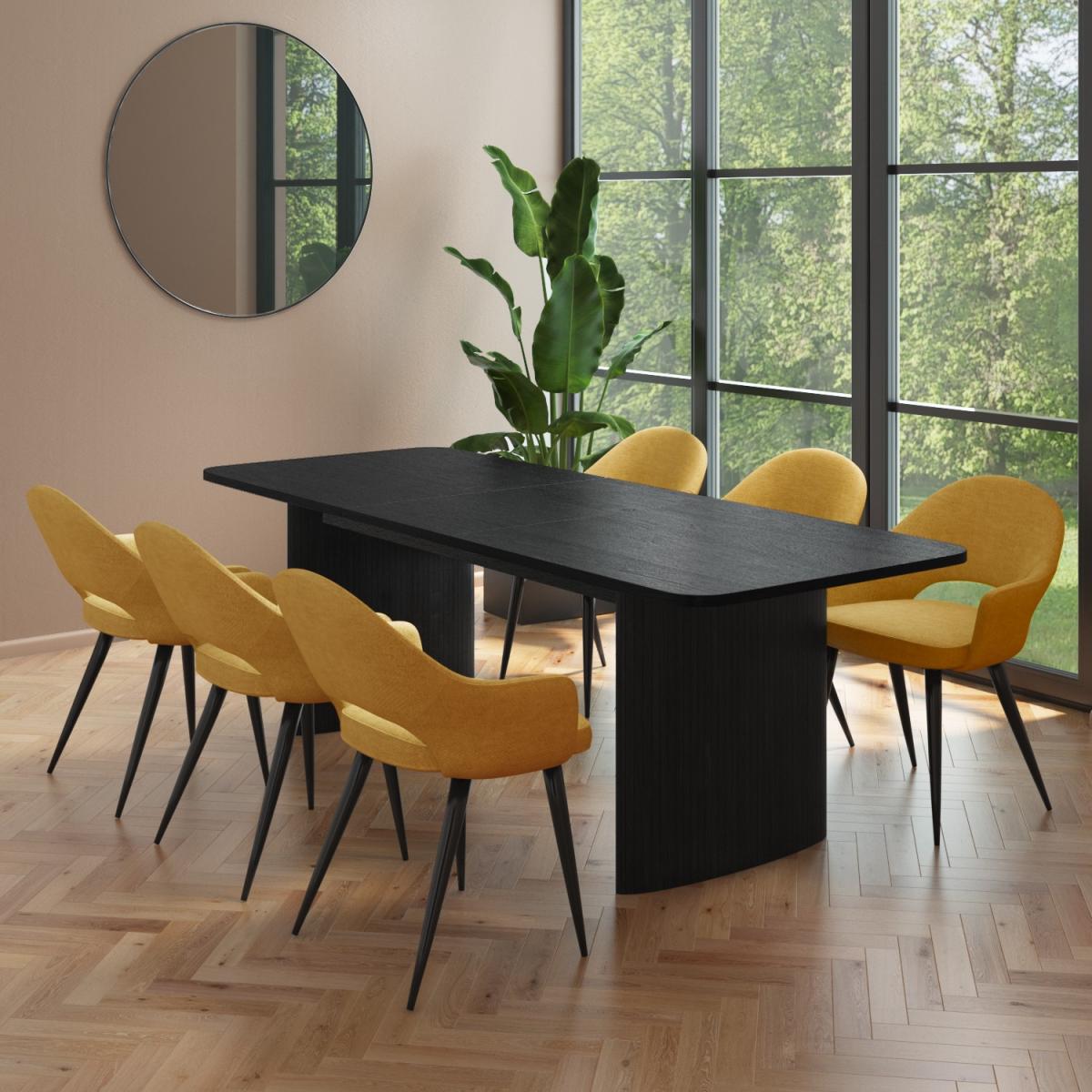 . This bundle includes. Black Oak Extendable Dining Table - Jarel. 6 x Mustard Fabric Dining Chairs - Colbie. Features we love Extendable dining table with textured legs. Comfortably entertain up to 6 guests Mustard chenille dining chairs with sleek black legs. Modern design to complement any dining room. Minimal assembly required for the chairs just attach the legs Need to know. Dining Table Information. Dimensions. H75 x W180 x D90 cm Extended dimensions. H75 x W220 x D90 cm Seats. 6 Material. Blackened oak veneer and solid oak Finish. Lacquered Extension mechanism. Butterfly Assembly required. Yes Dining Chair Information. Number of chairs. 6 Dimensions. H79 x W57 x D60 cm Material. Chenille fabric Finish. Yellow textured chenille fabric with sleek black legs Assembly required. Yes Range. Colbie..