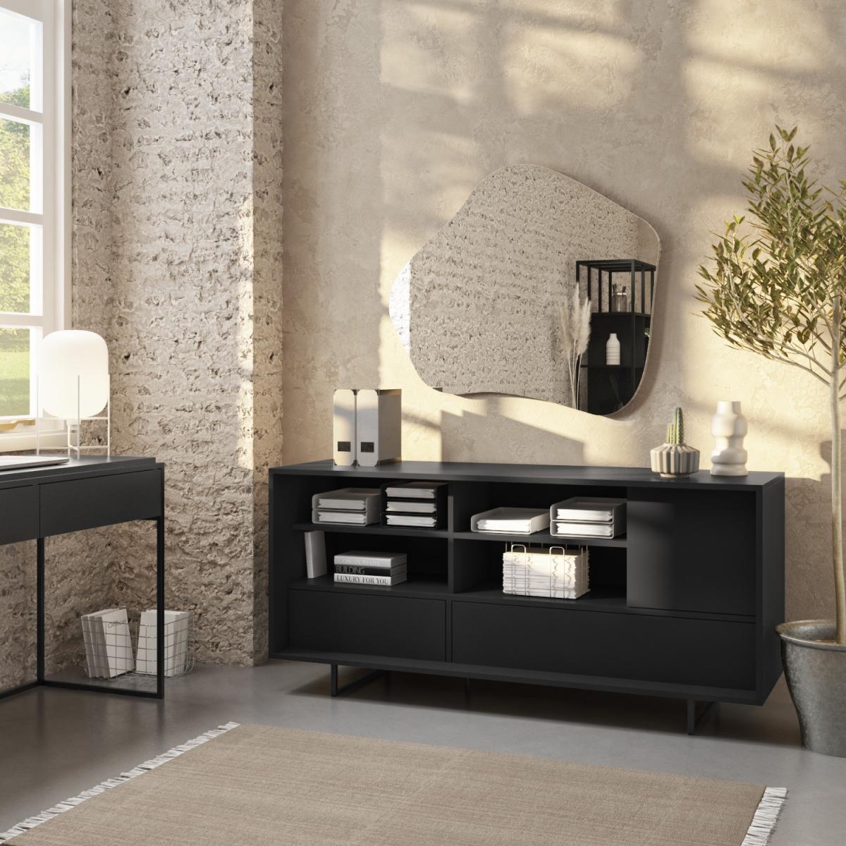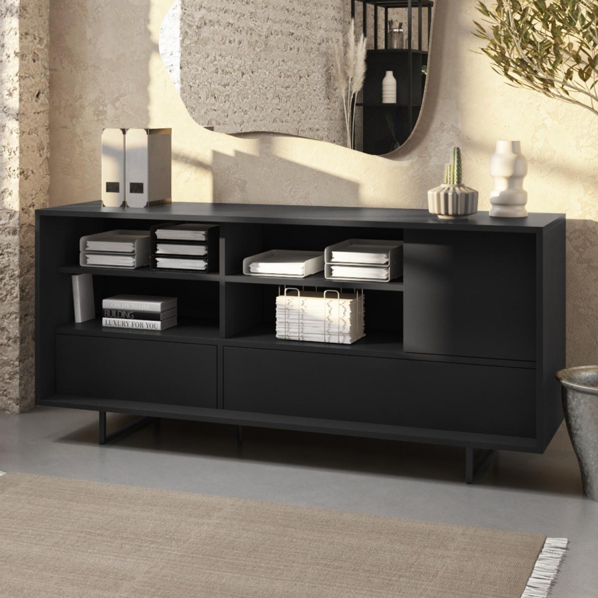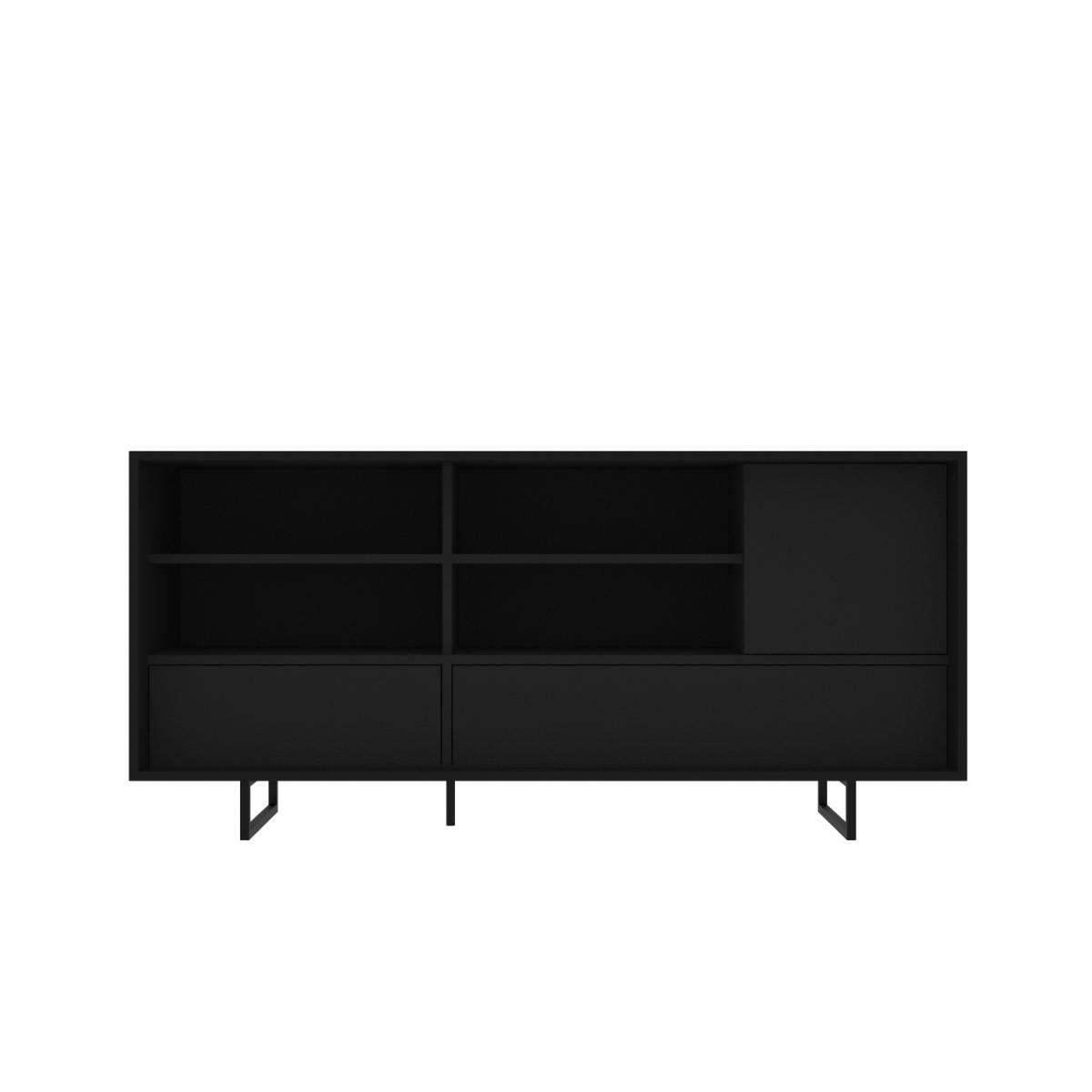 Features we love Industrial-inspired office storage unit in matt black 2 drawers & a 1-door cupboard with push-catch opening Multiple storage options to store office essentials Drawers are on metal runners for smooth movement Matt finish allows you to simply wipe the unit clean Need to know Dimensions: W160 x D45 x H75 cm Packaging dimensions: Box 1: H11.5 x W166 x D52.5 cm, Box 2: H12.5 x W163.5 x D45.5 cm, Box 3: H24 x W67 x D53 cm Product weight: 66.2kg Total number compartments: 6 with 3 shelves Total number doors: 1 with 2 hinges Total number drawers: 2 on metal runners Number of legs: 2 bar legs and 1 central leg Colour: Black Finish:Matt veneered wood Material:Strong MDF board andiron (leg base) For use: Indoors Assembly required: Yes