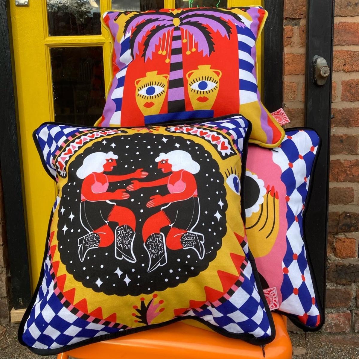 A handmade cushion by The Neighbourhood Threat. Featuring an original design by Holly Ramsay. Handmade to order from our studio in Manchester!  This cushion is trimmed with a handmade velvet piping, and backed with luxurious black velvet. Size is approximately 40cm x 40cm. HAND WASH ONLY