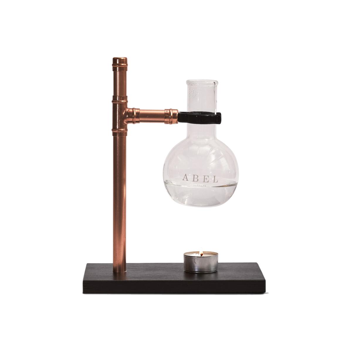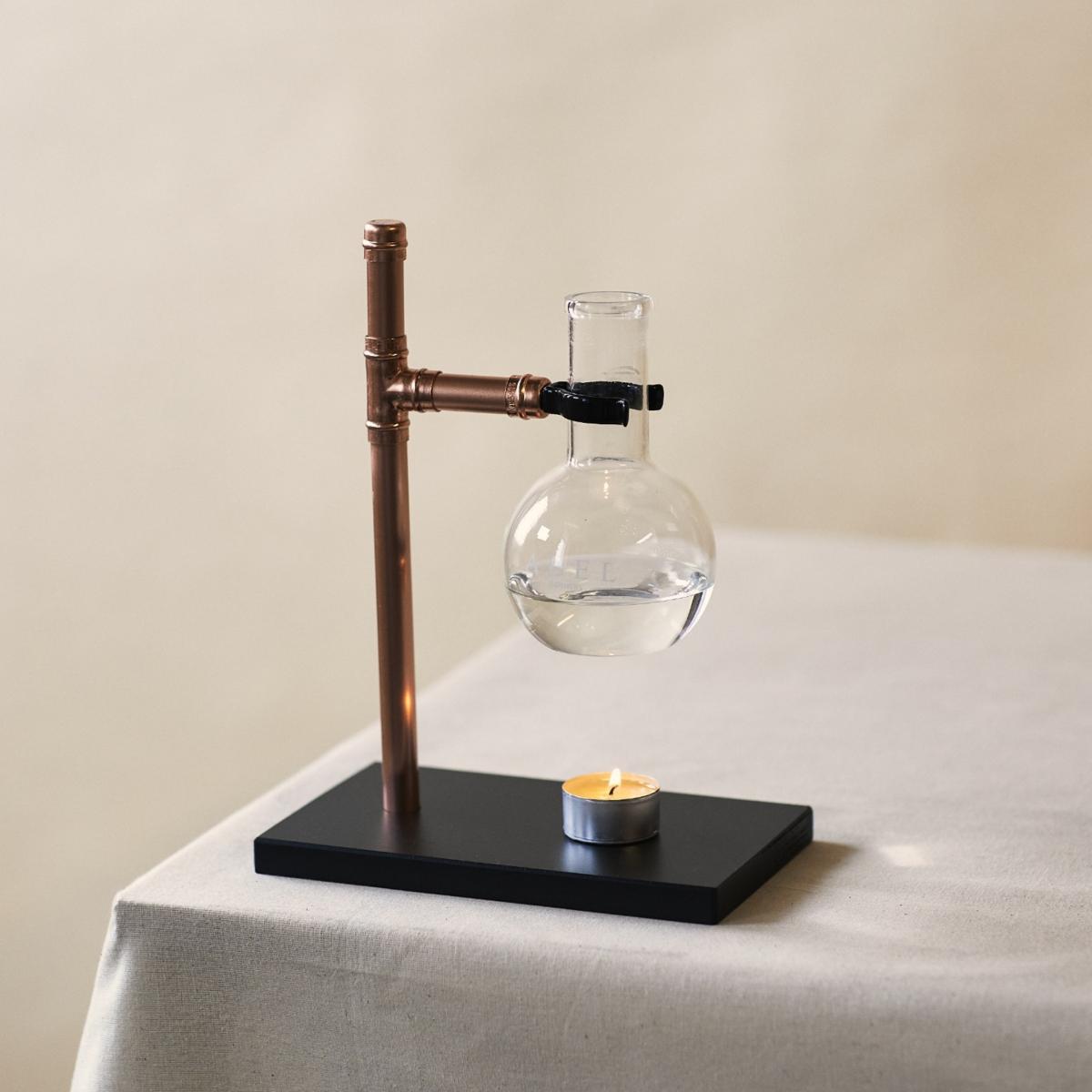Our Black Ply & Copper Abel oil Burner. Simple and beautiful, this burner will relax you instantly. Be mesmerised by the candle creating beautiful light patterns through the flask as it gently diffuses your favourite scent. Abel is lovingly handmade in Cornwall from repurposed Industrial materials, and natural, hand cut wood. Please expect serial numbers on your copper, knots and grain in the wood, and the unique patina that comes with a product not made in the thousands by a machine, but hand cut, prepared, painted and assembled by a tiny little business in rural Cornwall. We're not perfect, and we don't want to be! We're here for handmade. Please read the safety information supplied in your box.