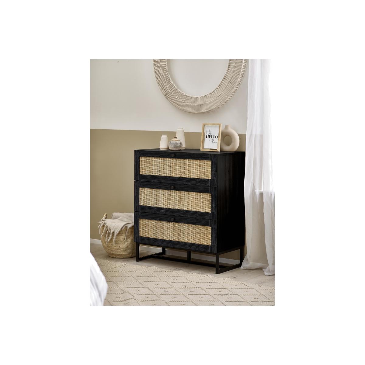 Features we love Rustic chest of 3 drawers with natural rattan fronts Black wood effect finish is perfect in any bedroom Three drawers provide ample storage for folded items Industrial style black metal legs and handles Part of the Julian Bowen Padstow bedroom collection All about me The Padstow rattan chest of drawers is the perfect blend of retro and modern design and complements any home decor. Check out the rest of the range for the bedside table, 6-drawer chest, and wardrobe. Also available in an oak effect finish. Need to know Dimensions: W80 x D40 x H90 cm Drawer dimensions:W69 x D36 x H22 cm Number of drawers: 3 Weight: 32kg Colour:Black and brown Material: Melamine, rattan front and metal base Assembly required: Yes Guarantee: 12 months
