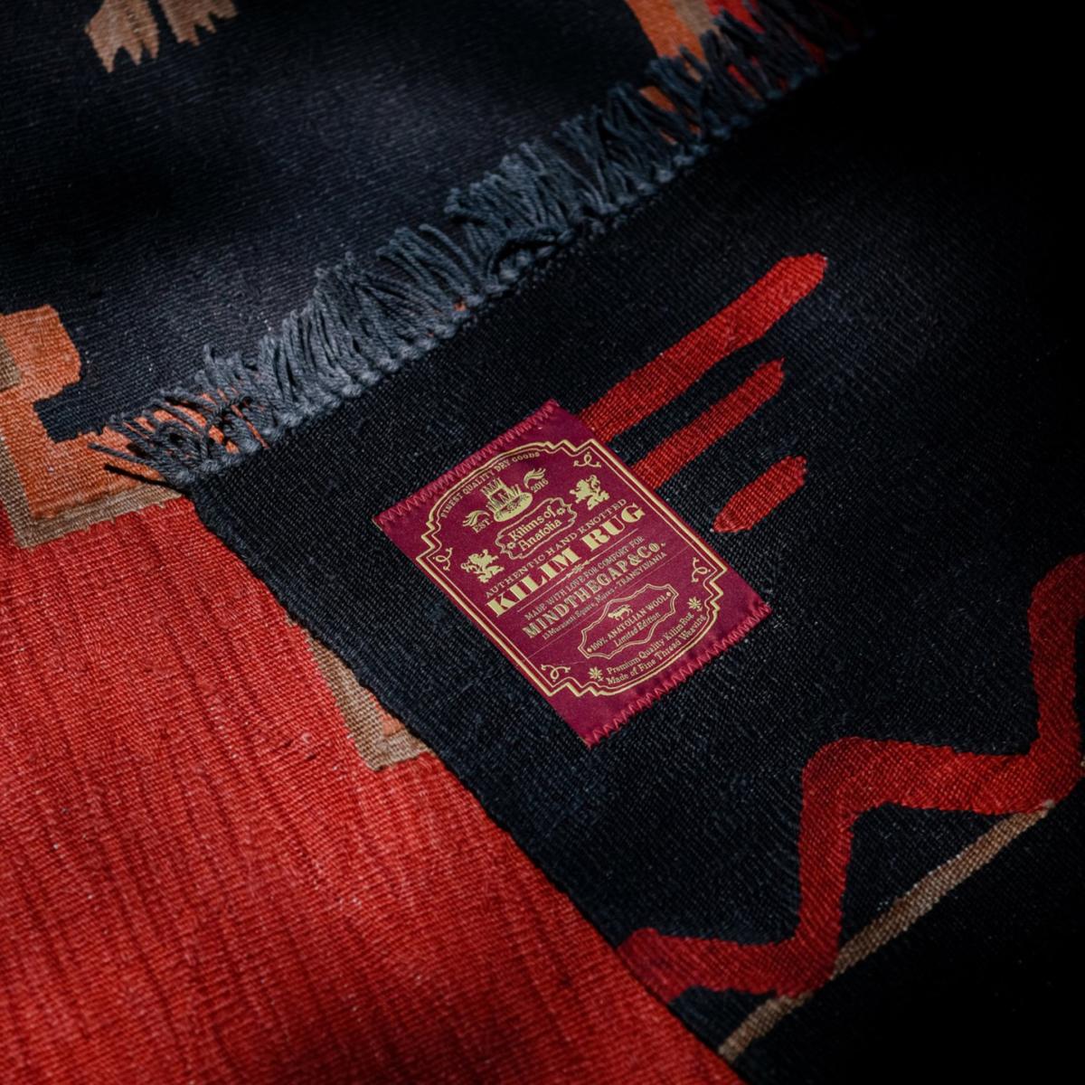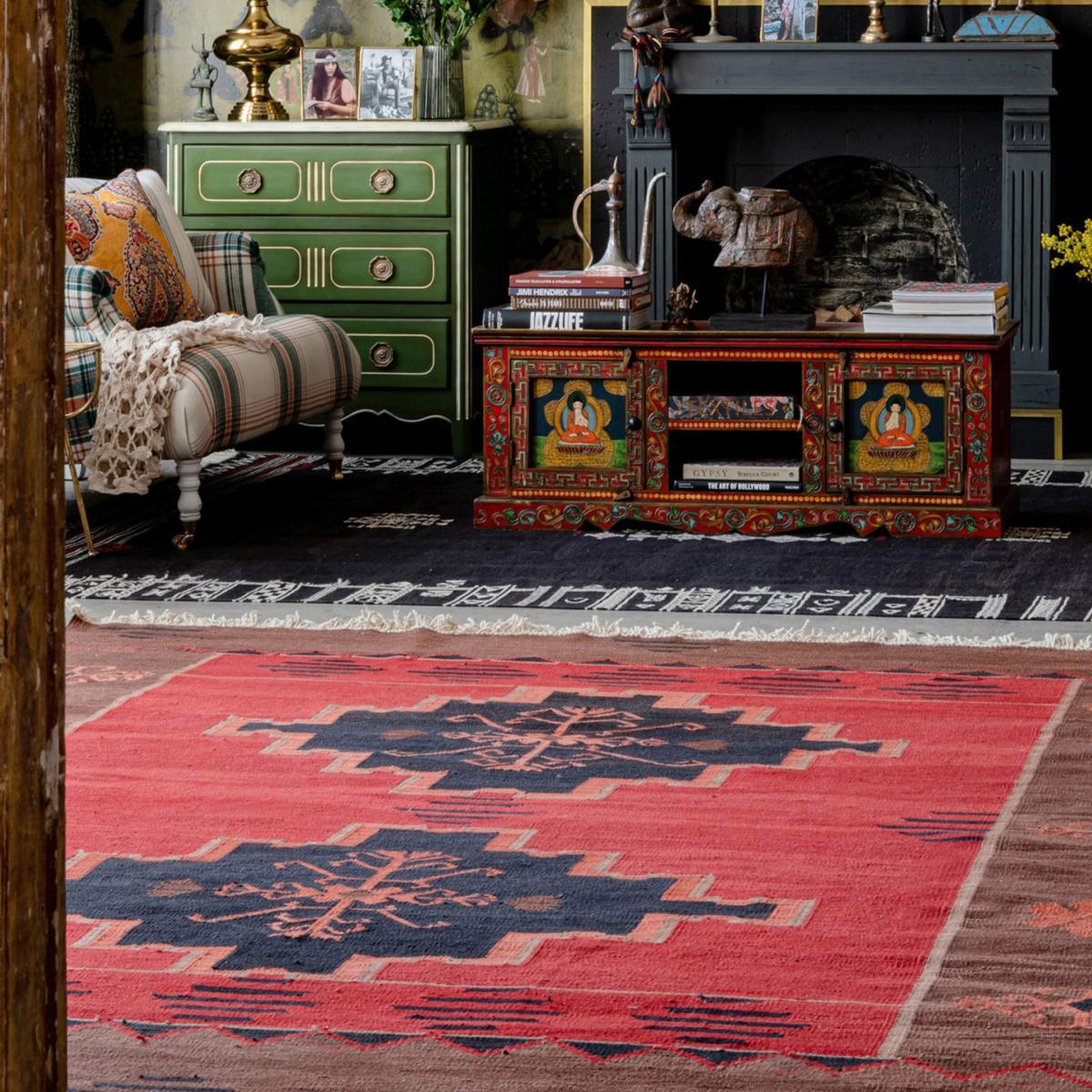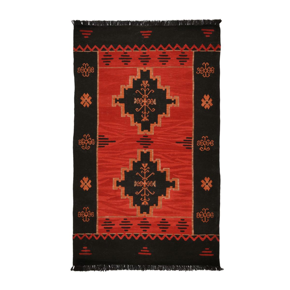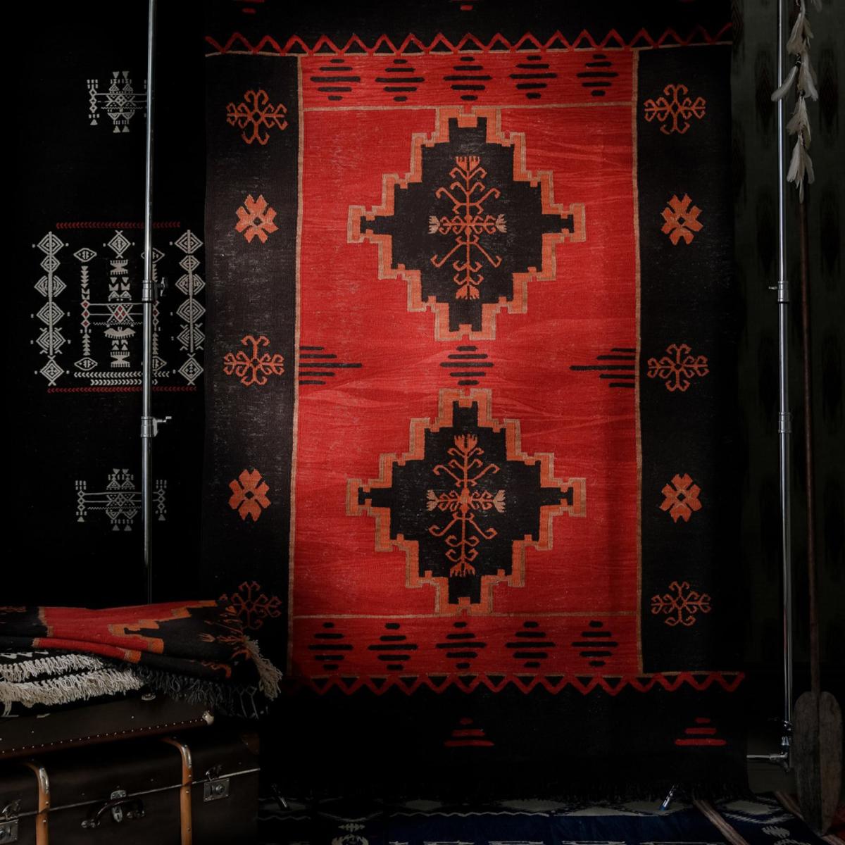 Hand-knotted from pure wool and coloured with natural vegetable dyes, this bright red and black kilim design was inspired by the authentic Anatolian rugs. Showing ornamental motifs and forms specific to Turkish culture, this flat-woven wool rug is complemented with black fringeso on both ends. Available in two different sizes, Yadigari is a really striking piece that can sit as a statement rug in any type of interior.
