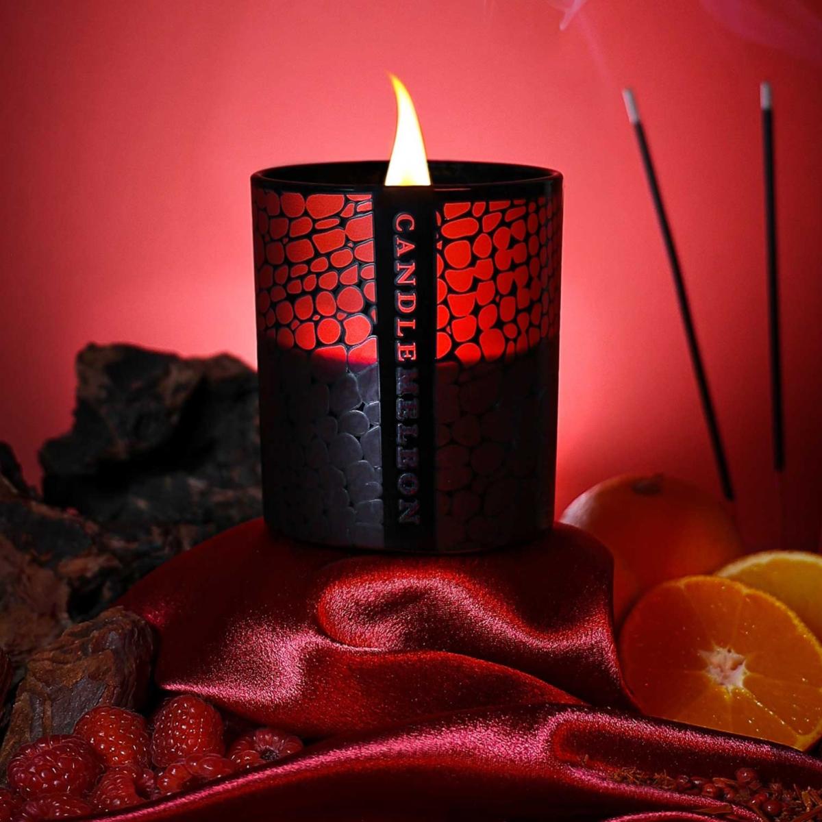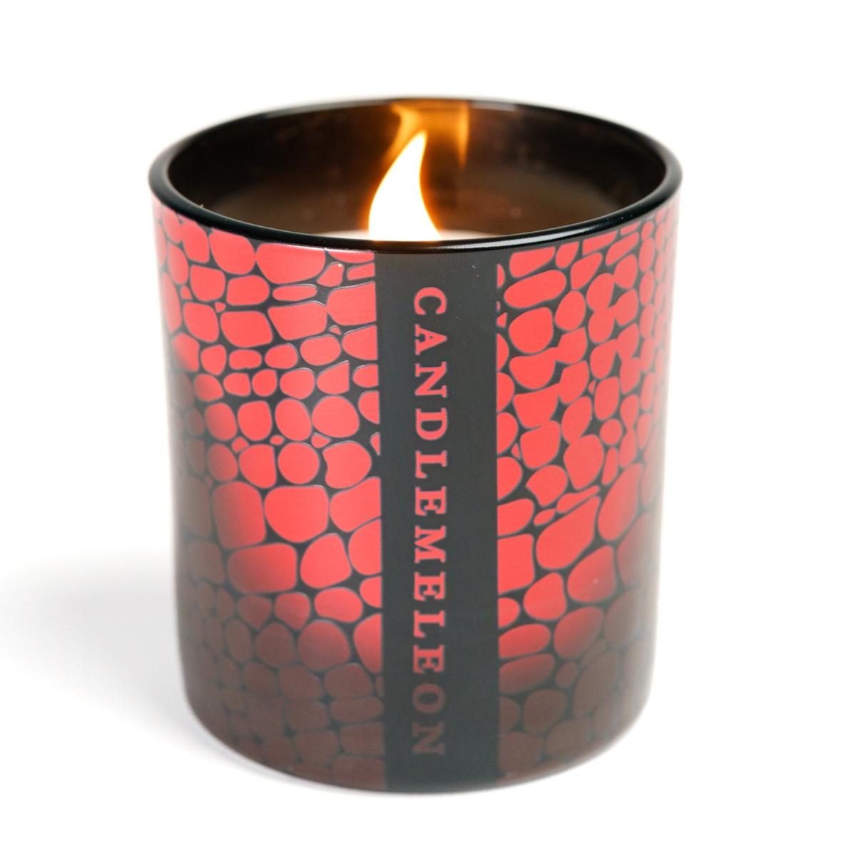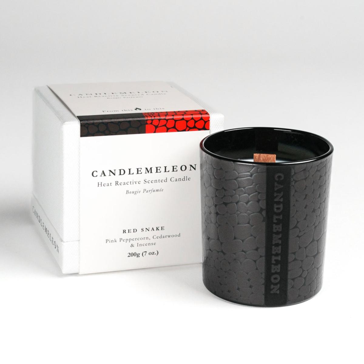Charm your senses with the colour changing Candlemeleon Red Snake wood wick candle, wrapping yourself in its delicious, peppery-spiced fragrance. Its hypnotising notes of aromatic sweet orange and incense will entice you, while the undulating base notes of cedar and raspberry will ensure that you cannot escape its charms. The heat given by the flame warms your vessel making this snake print turn from black to red.