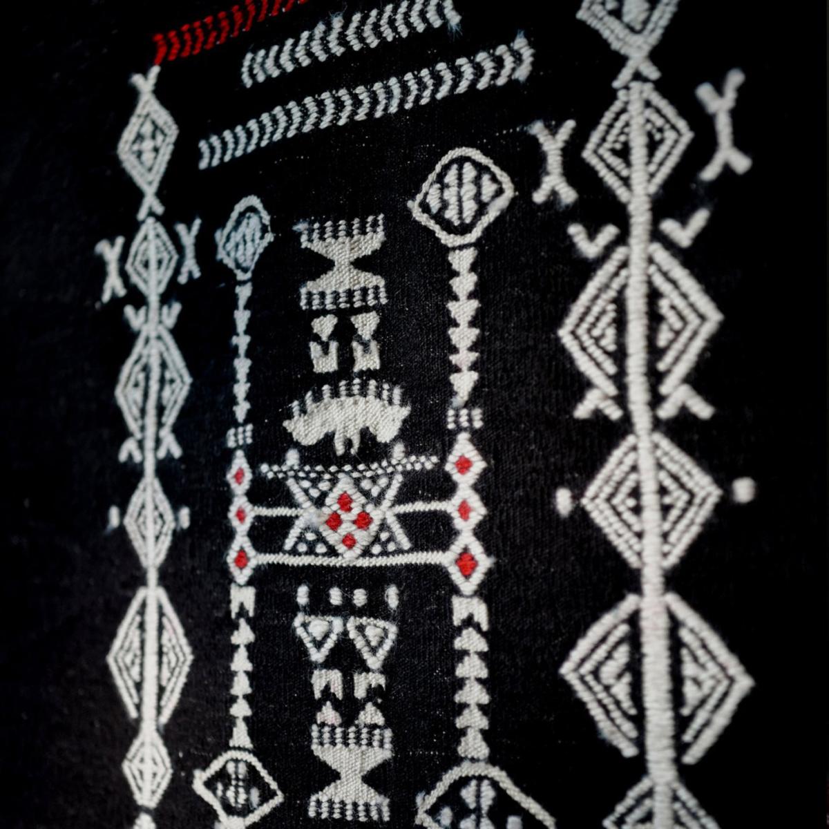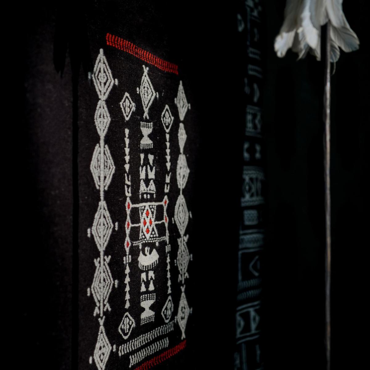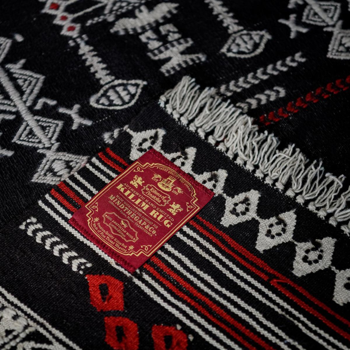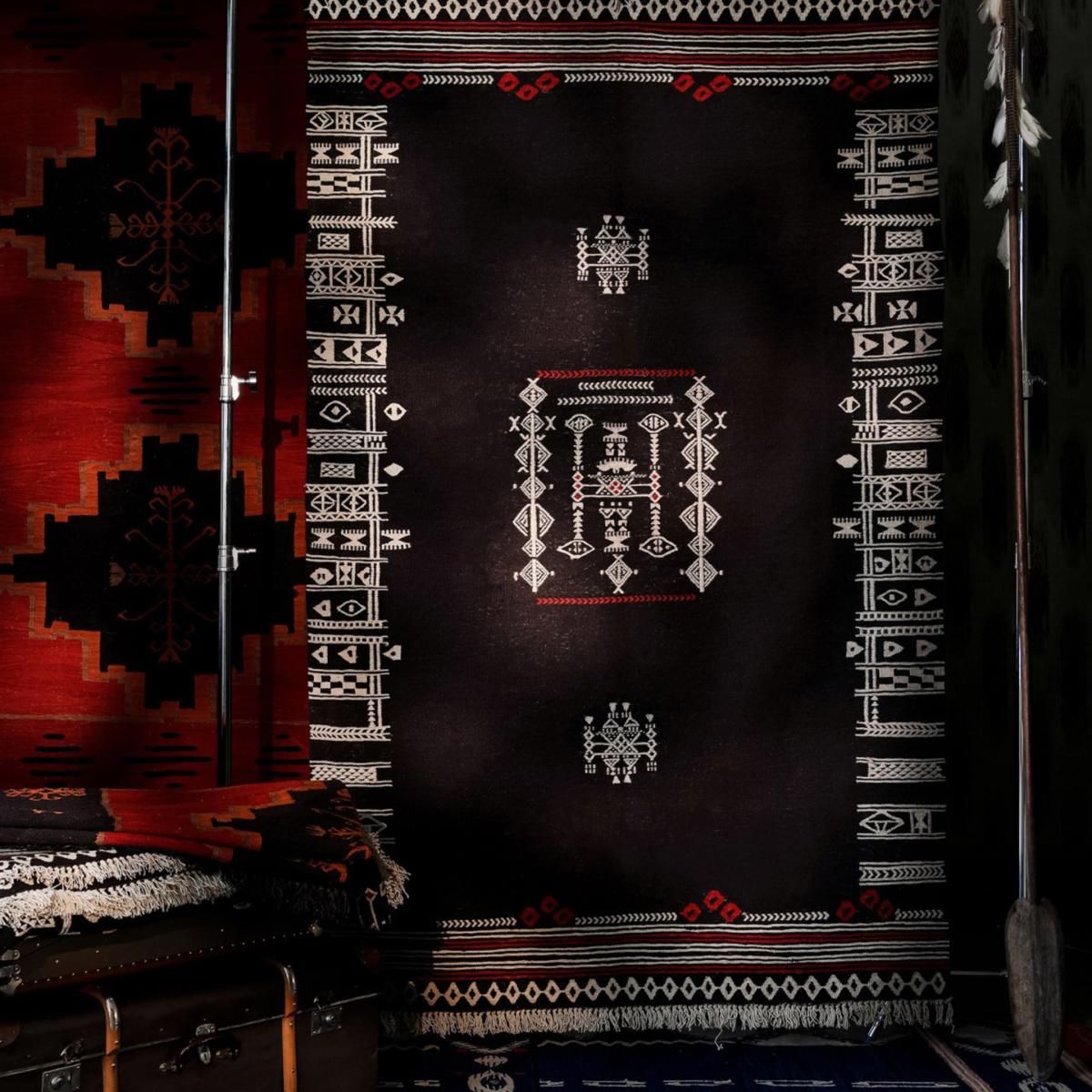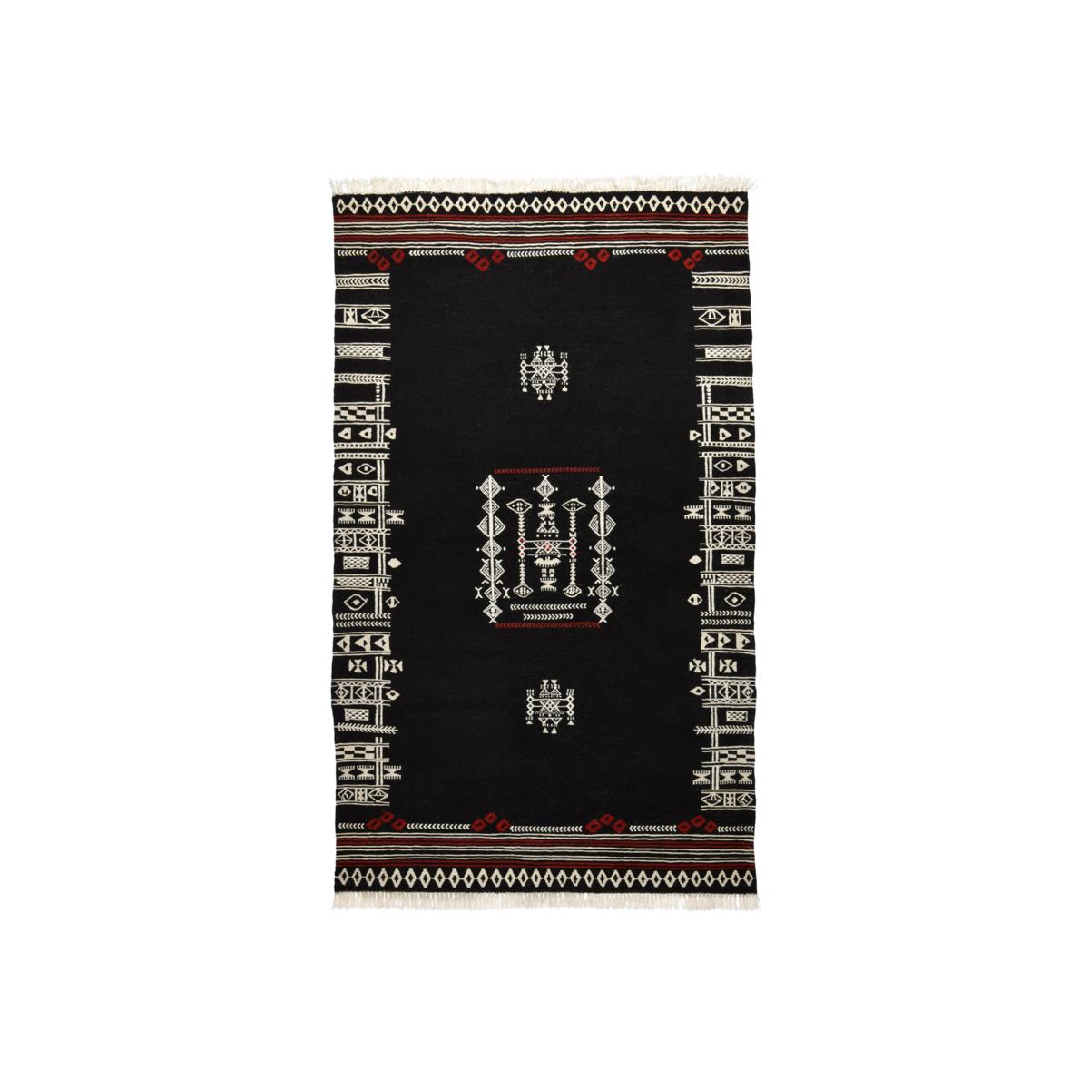 Hand-knotted from pure wool dyed with natural vegetable pigments, this black Anatolian kilim features an intricate mix of geometric and organic forms inspired by an antique South-East Turkish rug. With touches of red ornaments to complement the monochrome palette, this flat-woven rug bares the name of the bat, a popular symbol in Anatolian culture. Finished with white fringes on both ends, Yarasa is available in two different sizes.