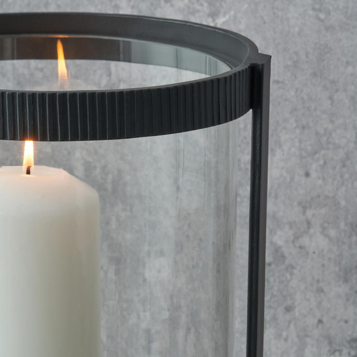* Round shape * Hurricane style * Ribbed metal detail * Two sizes available * Holds a pillar candle (not included) Bring a splash of industrial style to your home with this black metal hurricane candle holder. Featuring a ribbed detail on the metalwork and finished in a stylish black colourway, this candle holder would suit a range of interior styles and will add instant warmth and atmosphere.