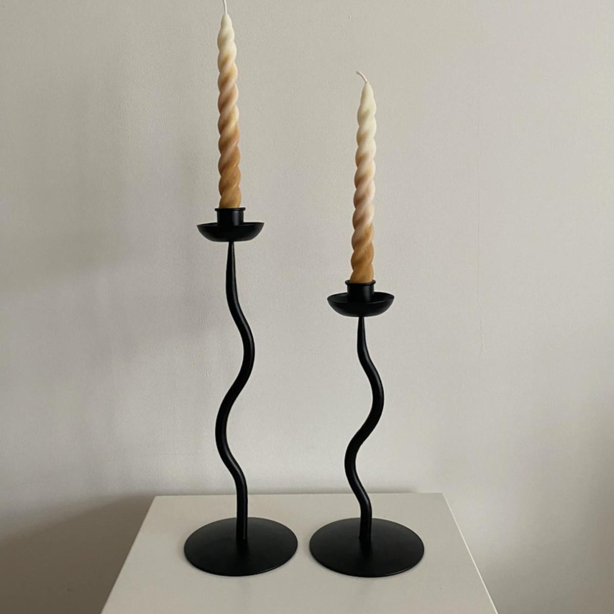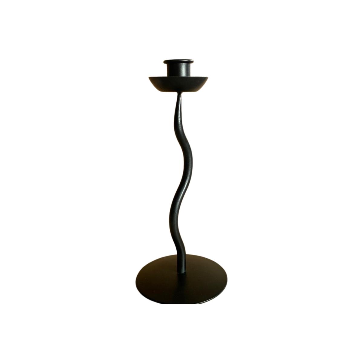 Influenced by classic Jean Royère curvaceous lighting and candle designs, the Royère black matte powder coated metal candleholders undulate and taper from the base to the top of the stem. Great on their own, but work perfectly as a pair on a mantel or team with the large Royère candle holder. Handcrafted by artisans these candleholders are a timeless addition to the home.