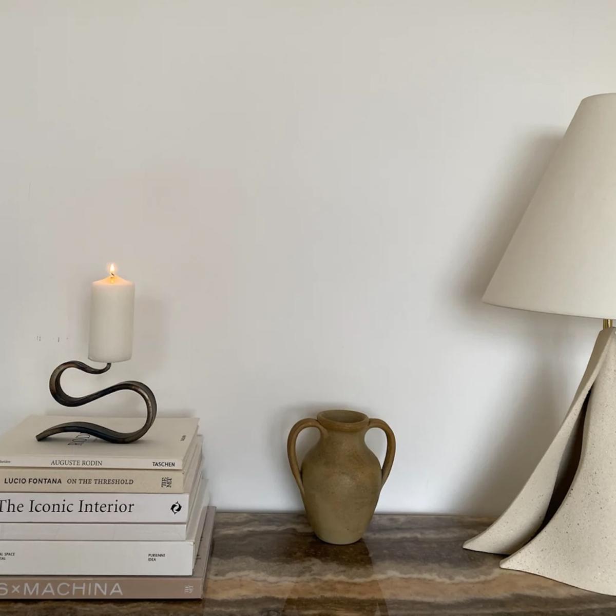 Smith forged metal candle holder, artisan crafted by hand using traditional methods. A curvy design that will hold various size candles and suits both traditional and contemporary homes. These handmade candle holders are crafted by a metal smith in the UK. Candle holders are stamped to the base with their makers mark. Finished with oil to create a burnished gunmetal iron effect. Pieces may have very subtle imperfections because of the manner they are produced. We embrace these as part of the item's inherent beauty by purchasing these you are also helping to preserve one of the world's oldest known crafts. Be careful of sharp point.