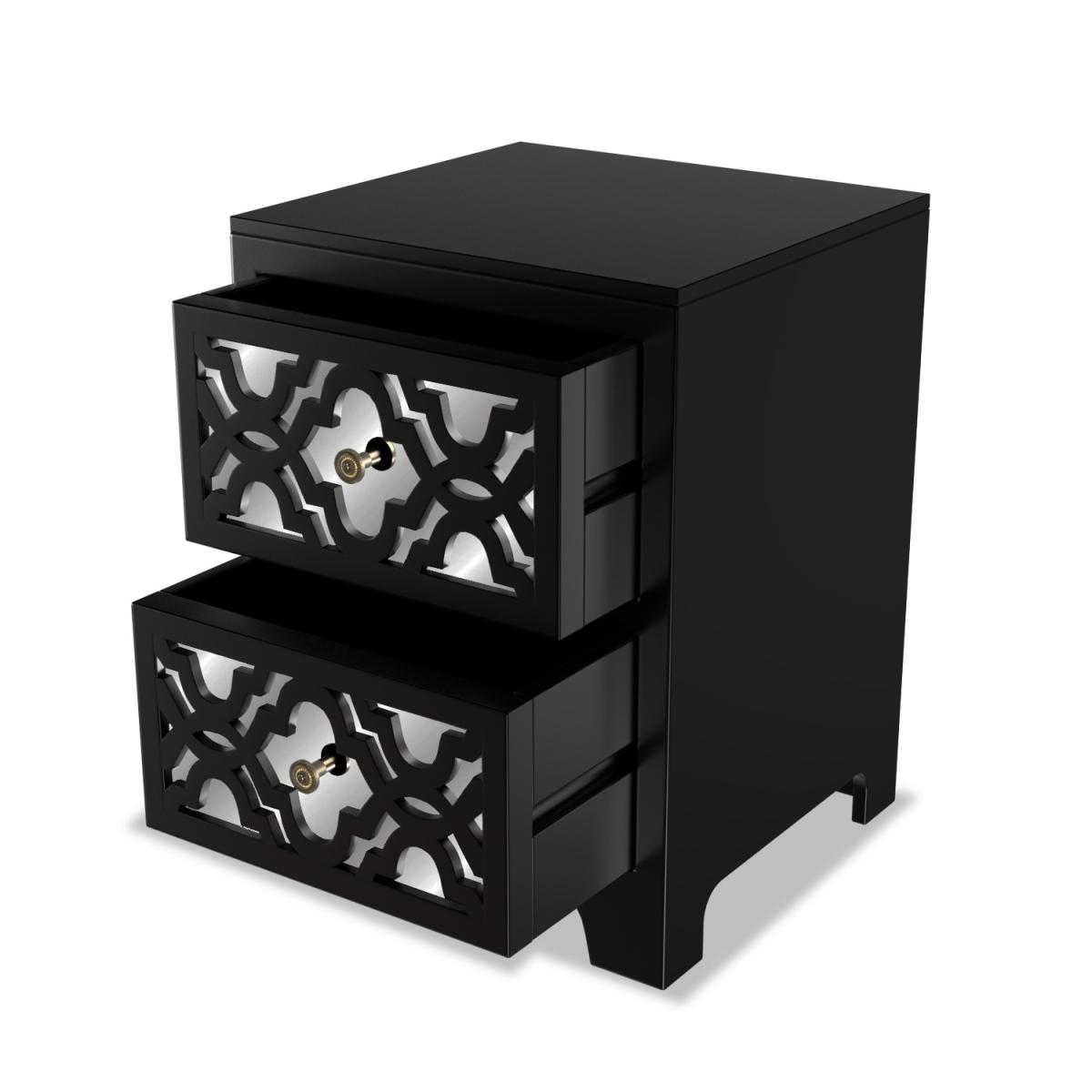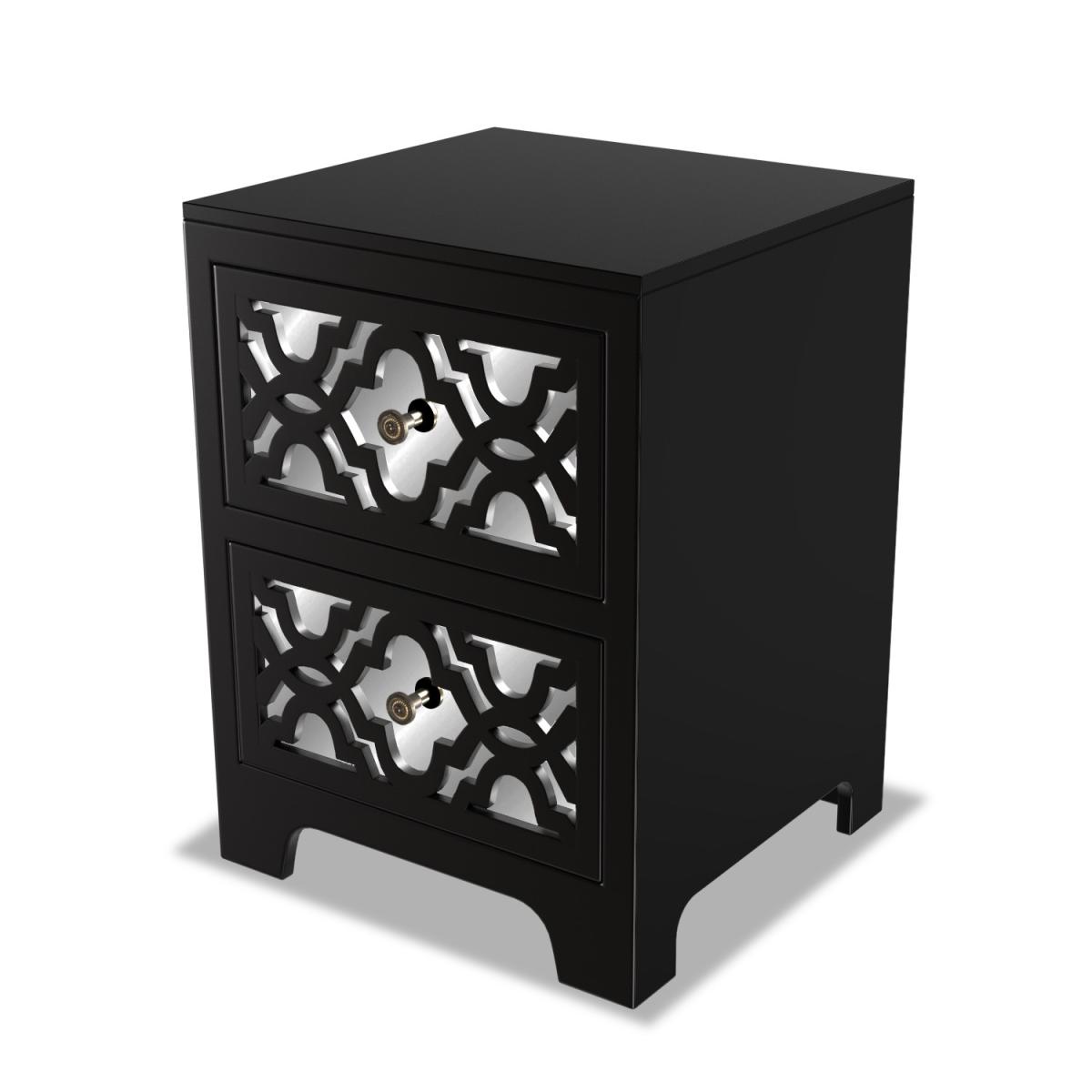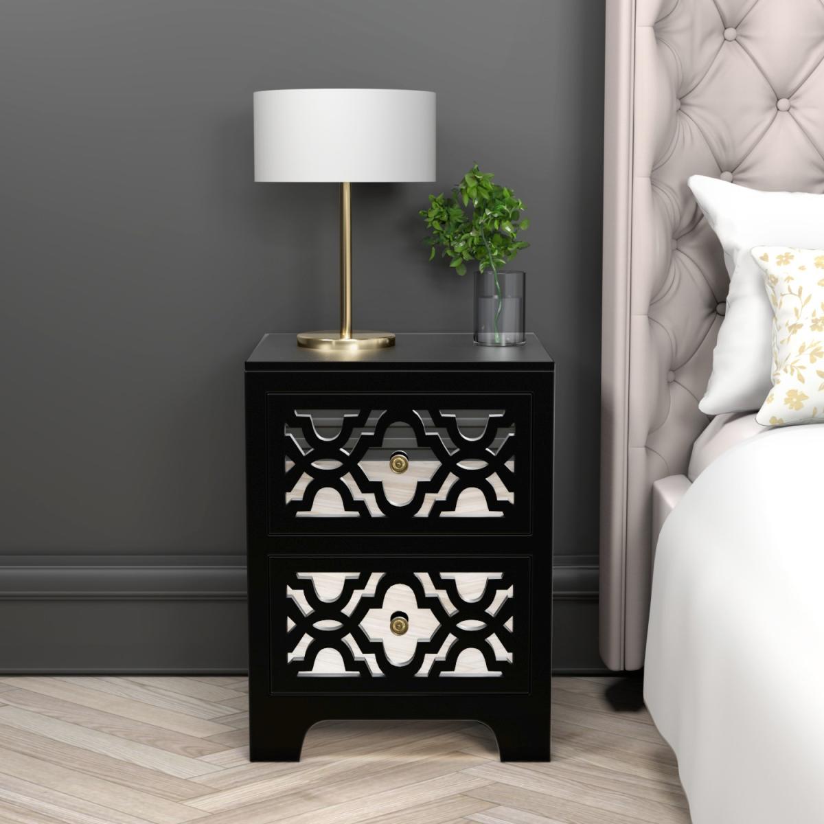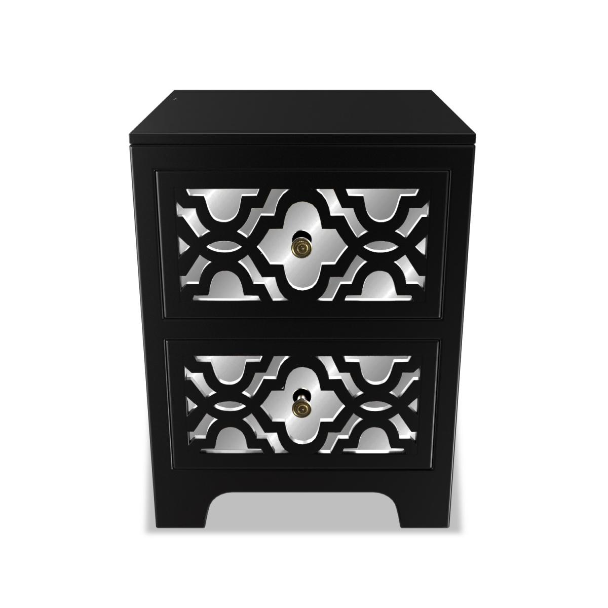 Beautiful bedside table made from solid mango wood Moroccan-inspired fretwork is mounted on mirrored panels Painted black finish adds a touch of glamour to any bedroom Arrives fully-assembled with two spacious drawers Makes a great statement piece - a talking point in any room Need to know Finish:Black and mirrored Material: Solid mango wood Assembly required: No