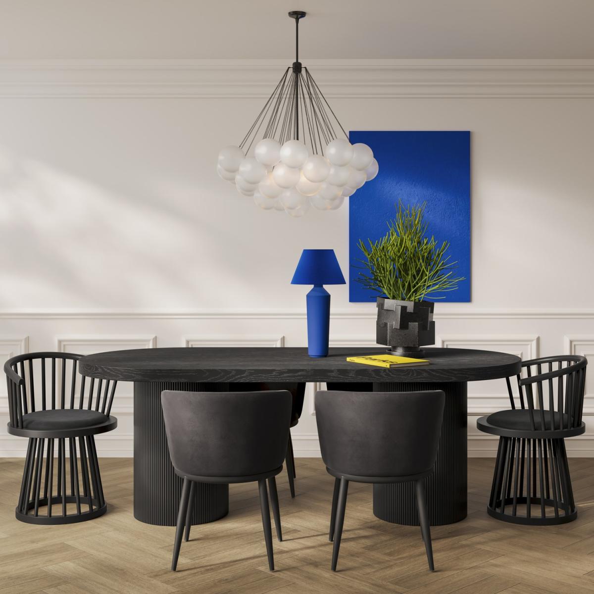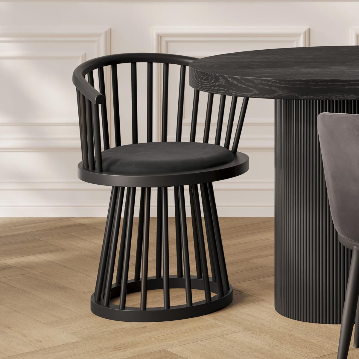 The luxurious black velvet upholstery offers a rich and tactile seating experience, providing comfort and style for long mealtimes or casual gatherings. The matte black satin wood finish enhances the chair’s contemporary appeal, offering a smooth, refined look that blends effortlessly with various décor styles. The elegant, curved spindle backrest not only adds visual interest but also provides supportive comfort. The distinctive cylindrical spindle base adds a unique structural element to the chair. With its clean lines and carefully crafted details, the Lina dining chair effortlessly combines functionality and beauty. The Lina dining chair seamlessly combines modern elegance and comfort, making it the perfect addition to your dining space. Featuring a luxurious soft black velvet seat, it offers both comfort and style for every meal. The black satin wood finish frame enhances its sleek and sophisticated design, while the curved spindle back and cylindrical base create a striking visual appeal. With its structural design, this chair adds a contemporary touch to any dining room, providing ample support and lasting comfort. Ideal for both casual dining and formal settings, the Lina dining chair elevates your home decor with its timeless and versatile aesthetic. Number of chairs: 1 Dimensions:W57 x D53 x H78.5 cm Weight: 8 kg Maximum Supported Weight: 100kg Colour:Black Finish: Upholstered Material: Velvet and Beech Wood Assembly required: No Package dimensions: W60 x D62 x H56 cm For domestic use only. Domestically UKFR certified.