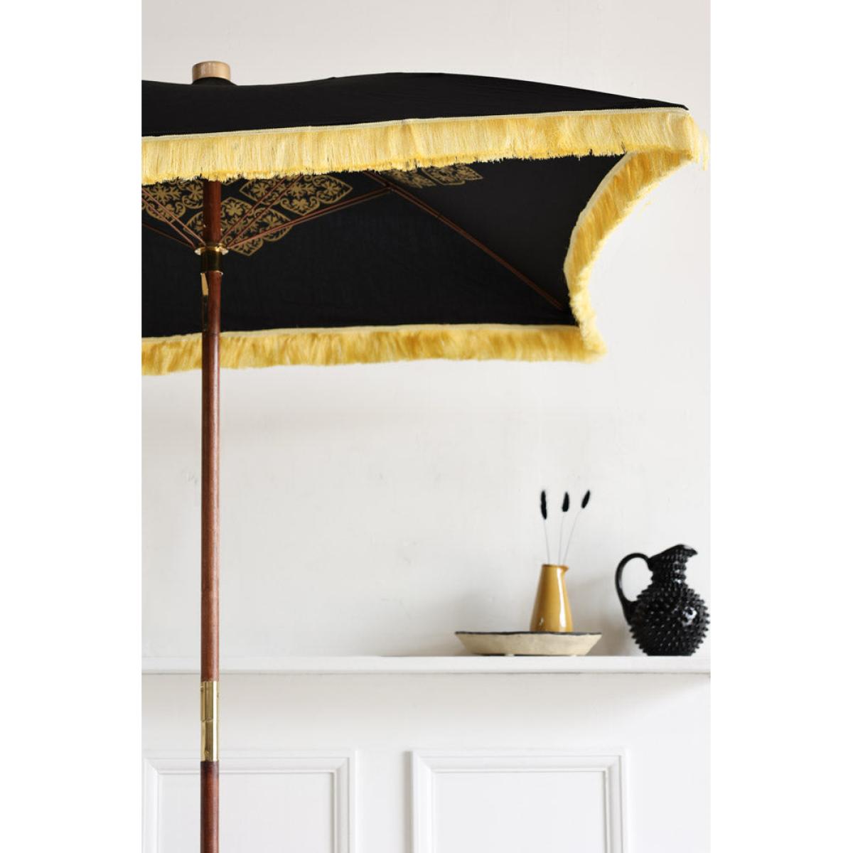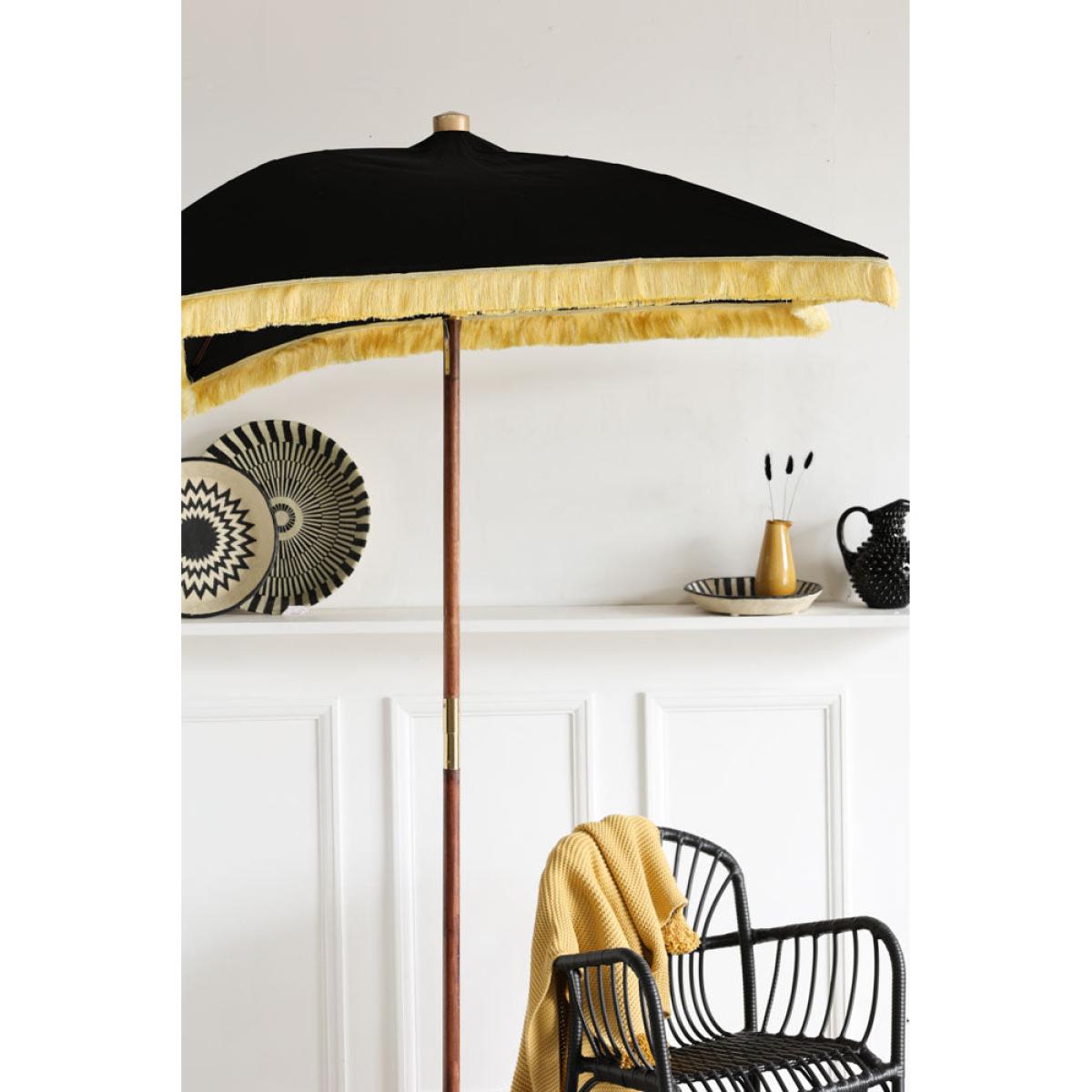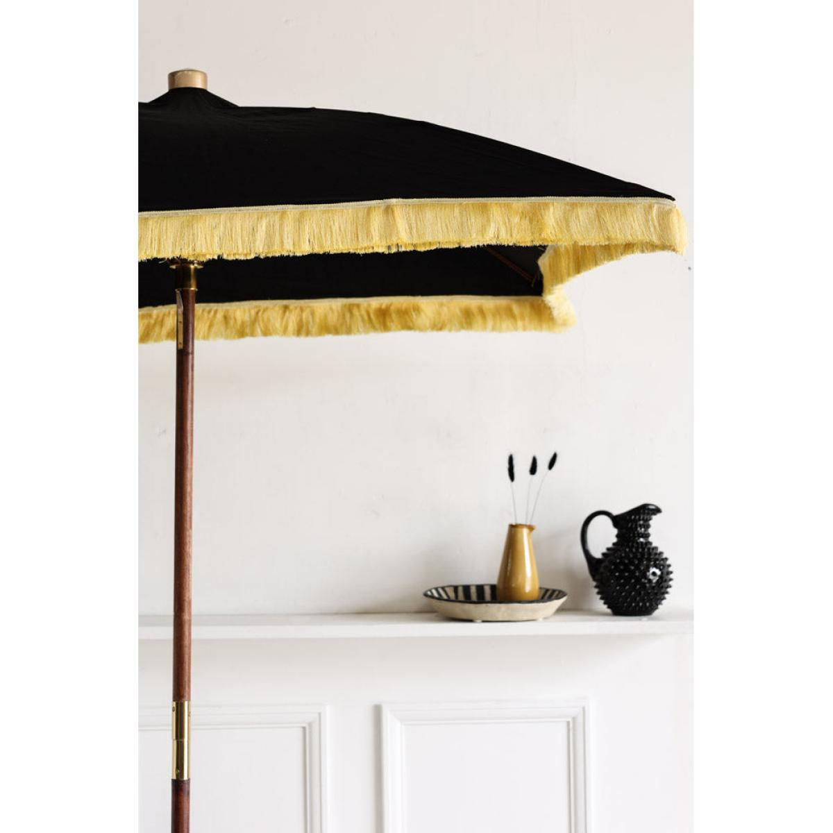 About The Black Square Printed ParasolCreate a bohemian oasis in your garden with the Black Square Printed Parasol. Showcasing a beautiful Moroccan-style design, this cotton parasol features an alluring square shape with a flat front and slightly arched back, yellow fringe, charming gold patterned print on the interior and a sturdy sprayed metal frame. Perfect for enjoying the hot summer months with friends and family, this square garden umbrella is secured by a wooden pole that comes in two separate parts and beautiful brass fittings to keep it in place. What’s more, this Moroccan parasol comes in a chic black carry bag so you can store it away or take it on your travels!Why We Think You’ll Love The Bohemian Square Garden ParasolExuding an abundance of boho character, this fringed parasol is perfect for creating a garden scheme that has a quirky personality and playful style. Showcasing a glamorously theatrical shaggy yellow fringe with a beautiful embellished print on the interior, this outdoor umbrella is an elegant and stylish choice of garden accessory that will make days and evenings spent outdoors all the more special, so what’s not to love?!How To Style The Boho Garden ParasolPerfect for small or large gardens, patios and large terraces, this fringed garden parasol will become an instant style spot that doubles up as a relaxing place to unwind. To go all out boho, we suggest laying one of our fabulous indoor-outdoor rugs underfoot and layer with various plush pillows to create the ultimate chill out haven. Alternatively, this boho garden umbrella would be great for enjoying an alfresco meal, so style it next to your garden table and chairs for a touch of respite from the harsh sun.