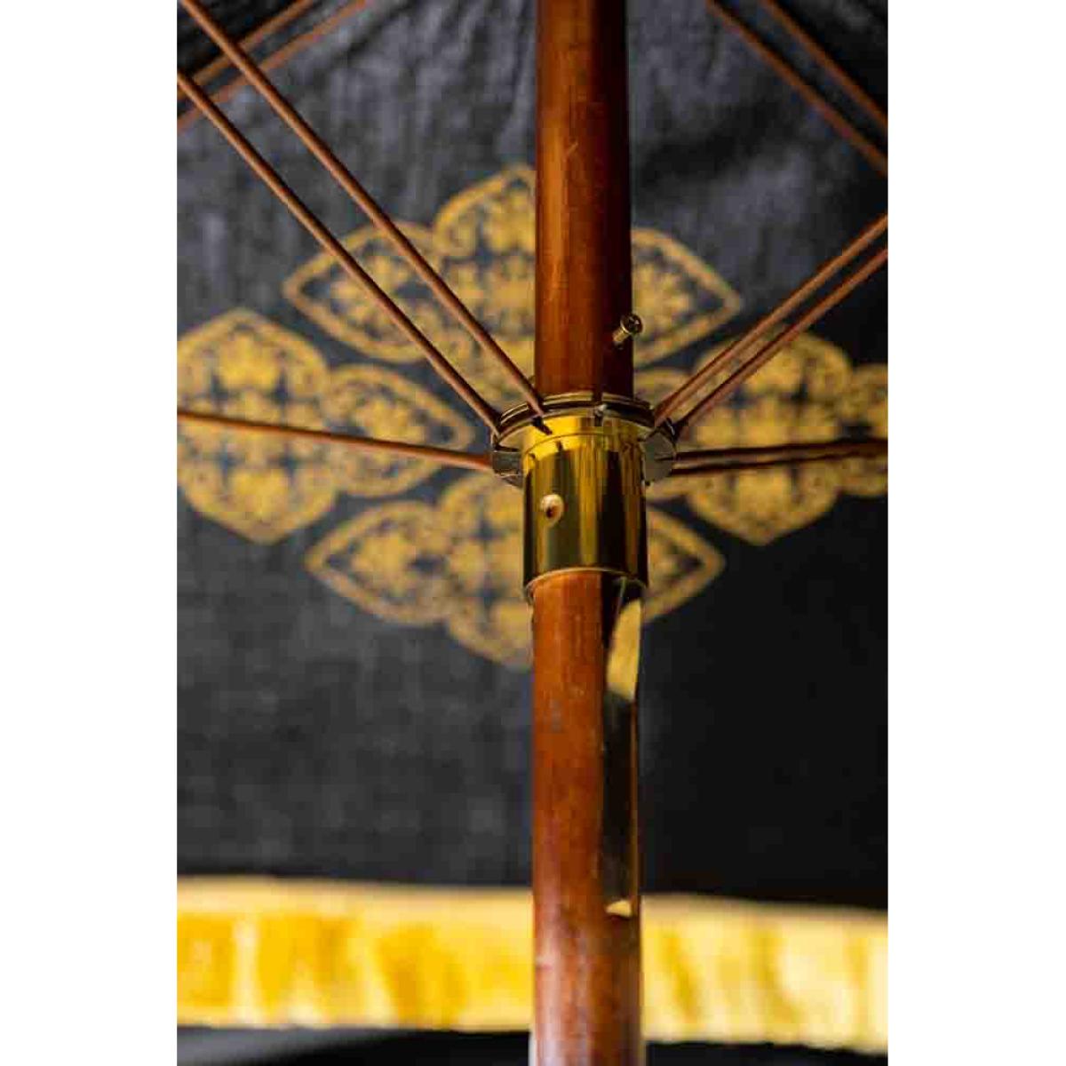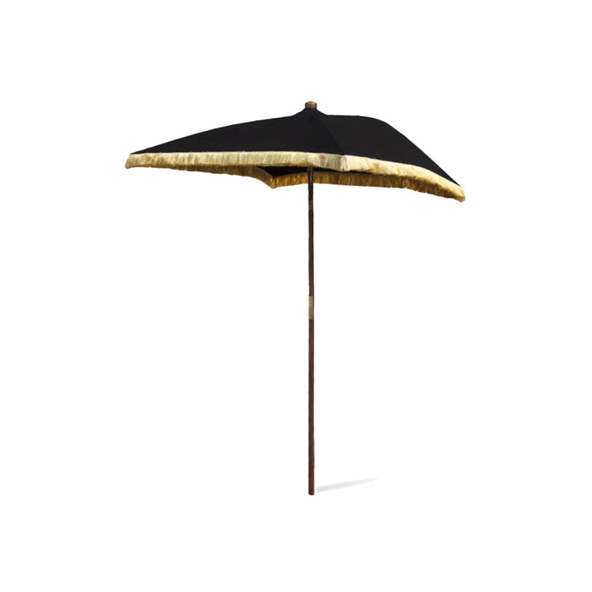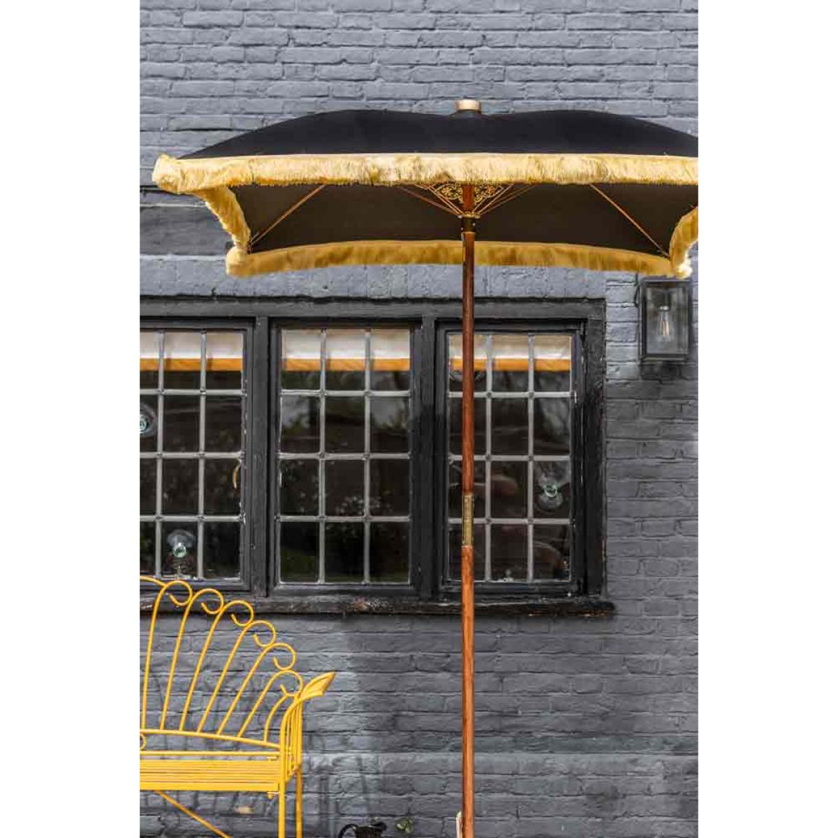About The Black Square Printed ParasolCreate a bohemian oasis in your garden with the Black Square Printed Parasol. Showcasing a beautiful Moroccan-style design, this cotton parasol features an alluring square shape with a flat front and slightly arched back, yellow fringe, charming gold patterned print on the interior and a sturdy sprayed metal frame. Perfect for enjoying the hot summer months with friends and family, this square garden umbrella is secured by a wooden pole that comes in two separate parts and beautiful brass fittings to keep it in place. What’s more, this Moroccan parasol comes in a chic black carry bag so you can store it away or take it on your travels!Why We Think You’ll Love The Bohemian Square Garden ParasolExuding an abundance of boho character, this fringed parasol is perfect for creating a garden scheme that has a quirky personality and playful style. Showcasing a glamorously theatrical shaggy yellow fringe with a beautiful embellished print on the interior, this outdoor umbrella is an elegant and stylish choice of garden accessory that will make days and evenings spent outdoors all the more special, so what’s not to love?!How To Style The Boho Garden ParasolPerfect for small or large gardens, patios and large terraces, this fringed garden parasol will become an instant style spot that doubles up as a relaxing place to unwind. To go all out boho, we suggest laying one of our fabulous indoor-outdoor rugs underfoot and layer with various plush pillows to create the ultimate chill out haven. Alternatively, this boho garden umbrella would be great for enjoying an alfresco meal, so style it next to your garden table and chairs for a touch of respite from the harsh sun.